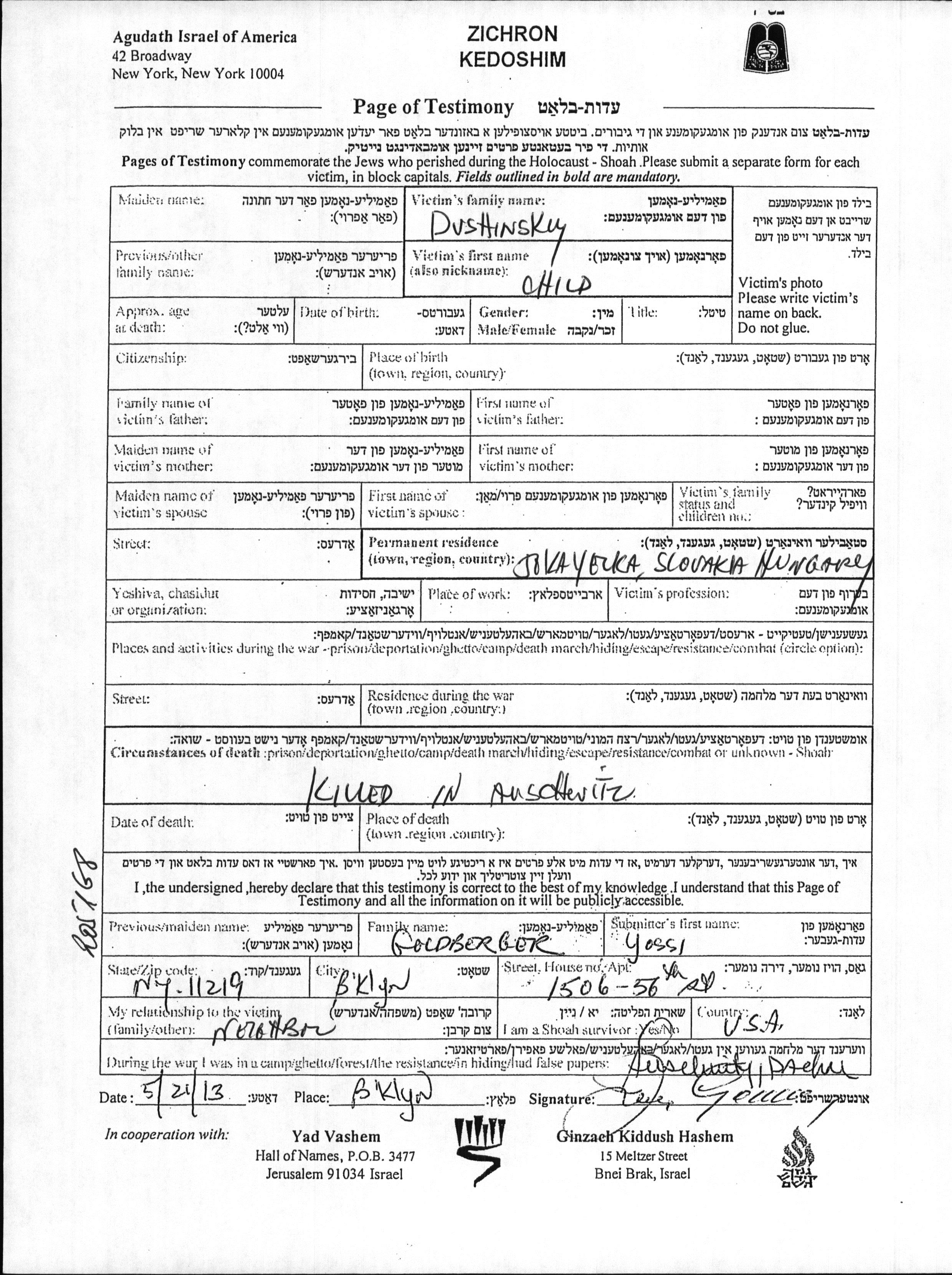 Душински Имя неизвестно Елька, Чехословакия Лист свидетельских показаний
