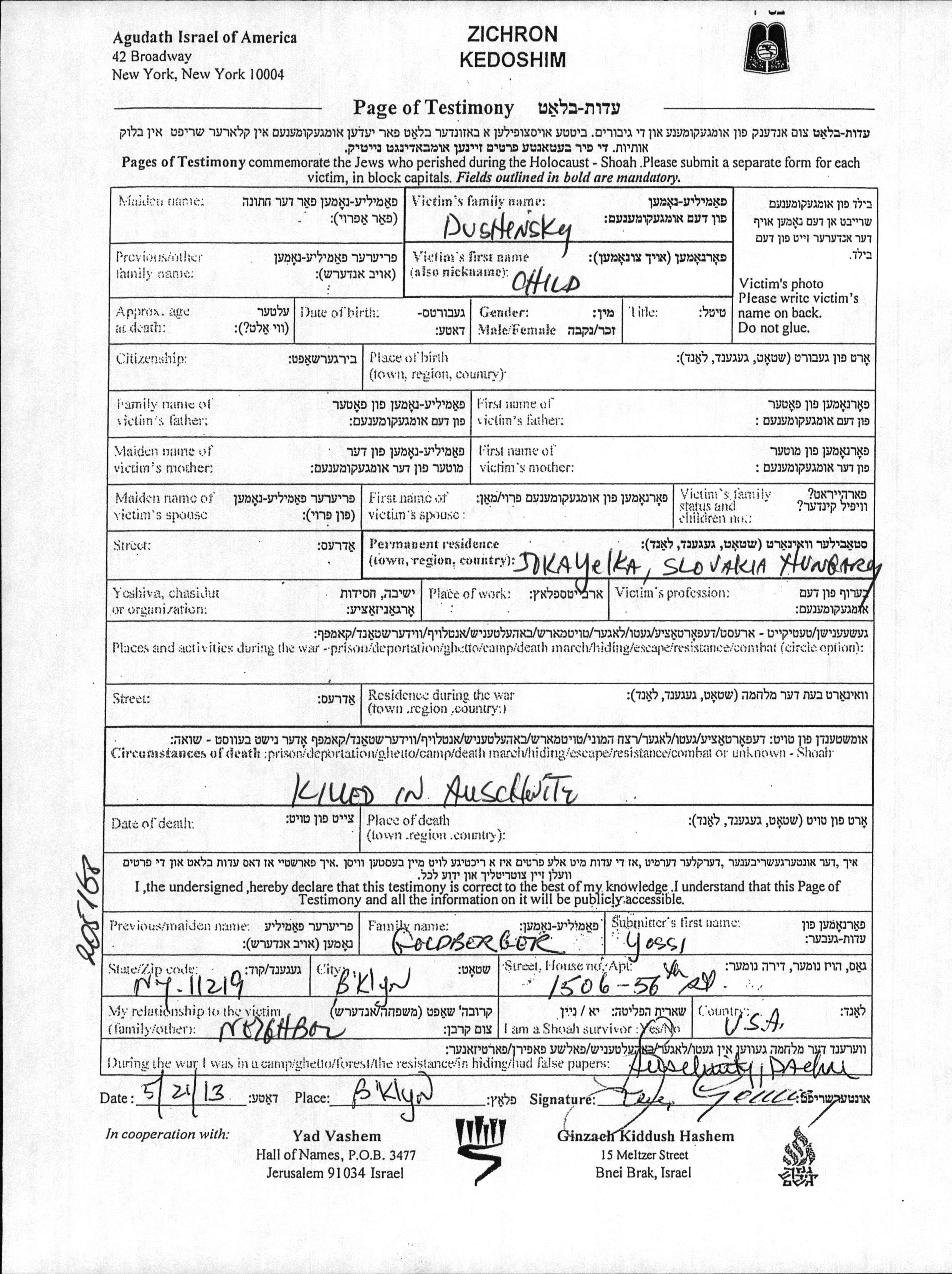 Душински Имя неизвестно Елька, Чехословакия Лист свидетельских показаний
