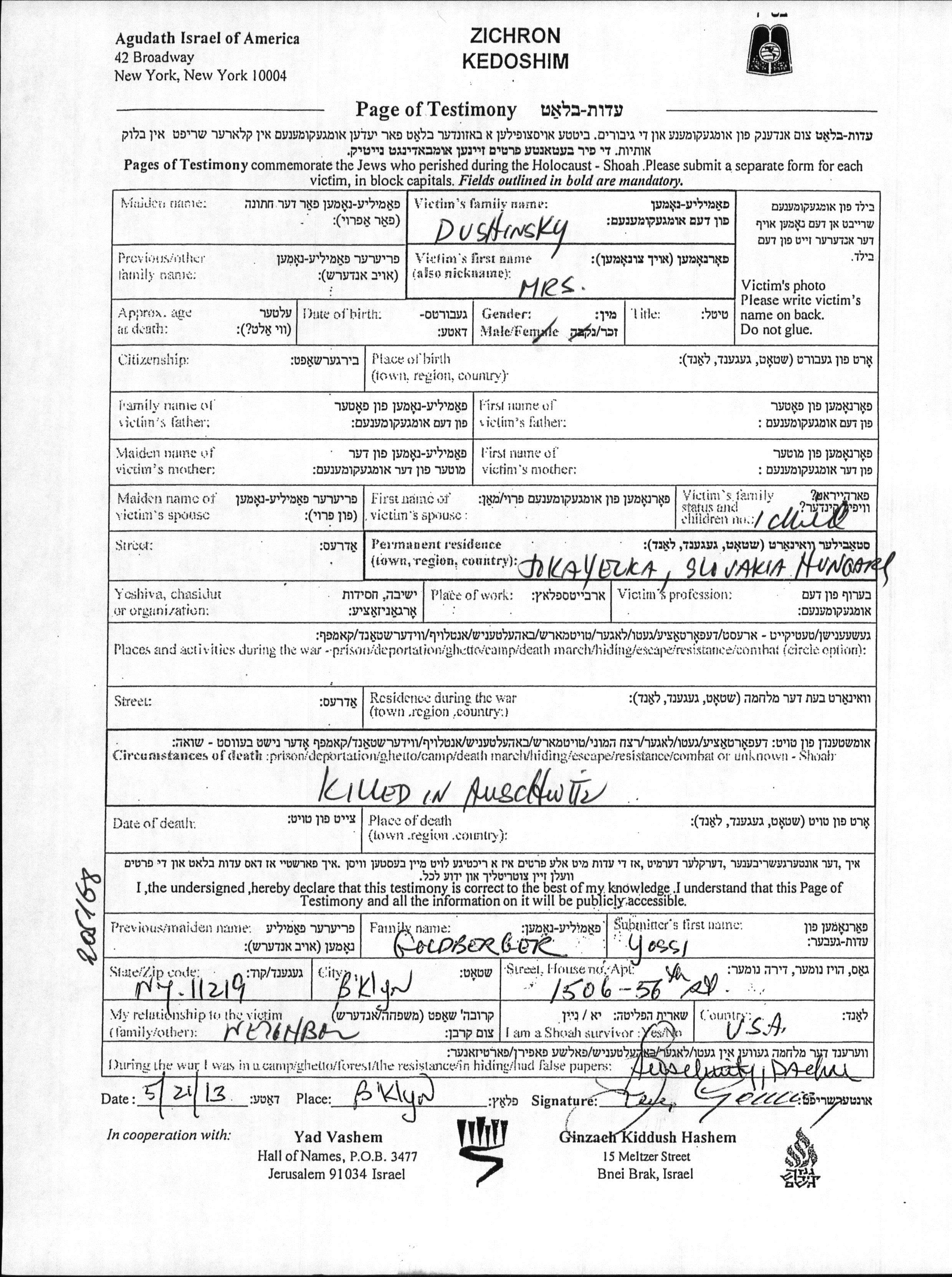 Имя неизвестно Душински. Женат / замужем. Место жительства до войны: Елька, Чехословакия. Место во время войны: Slovakia.