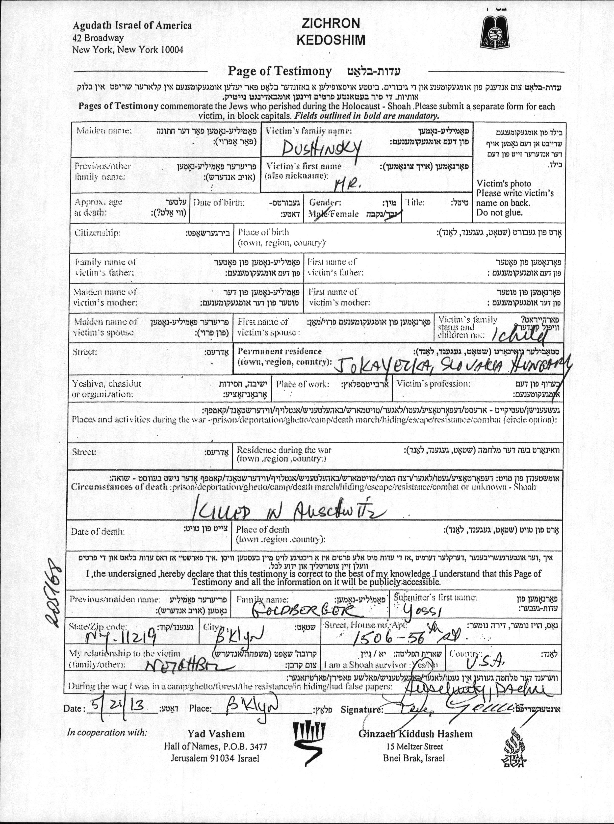 Имя неизвестно Душински. Женат / замужем. Место жительства до войны: Елька, Чехословакия.