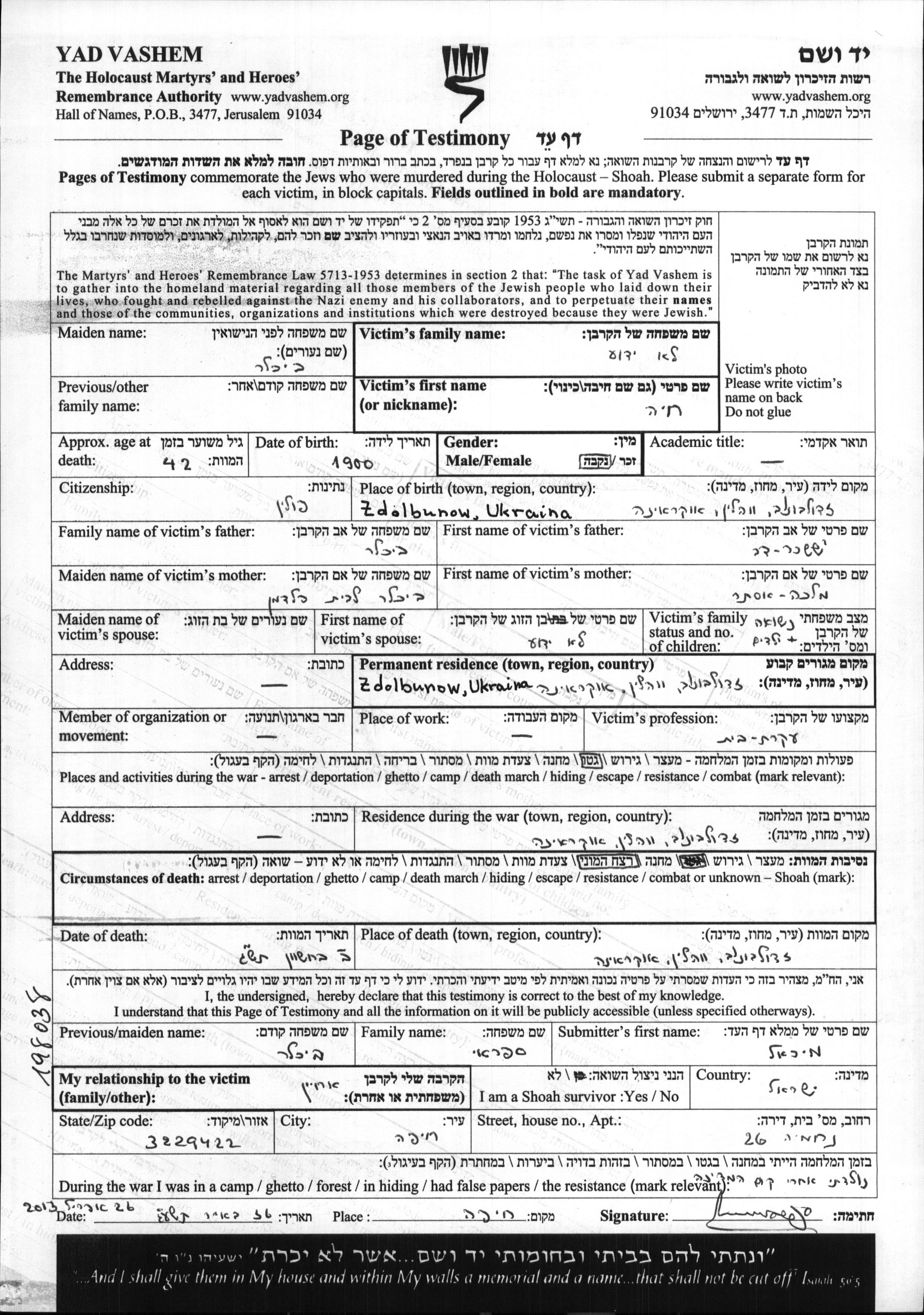 Яд Вашем - Листы свидетельских показаний Мемориального фонда