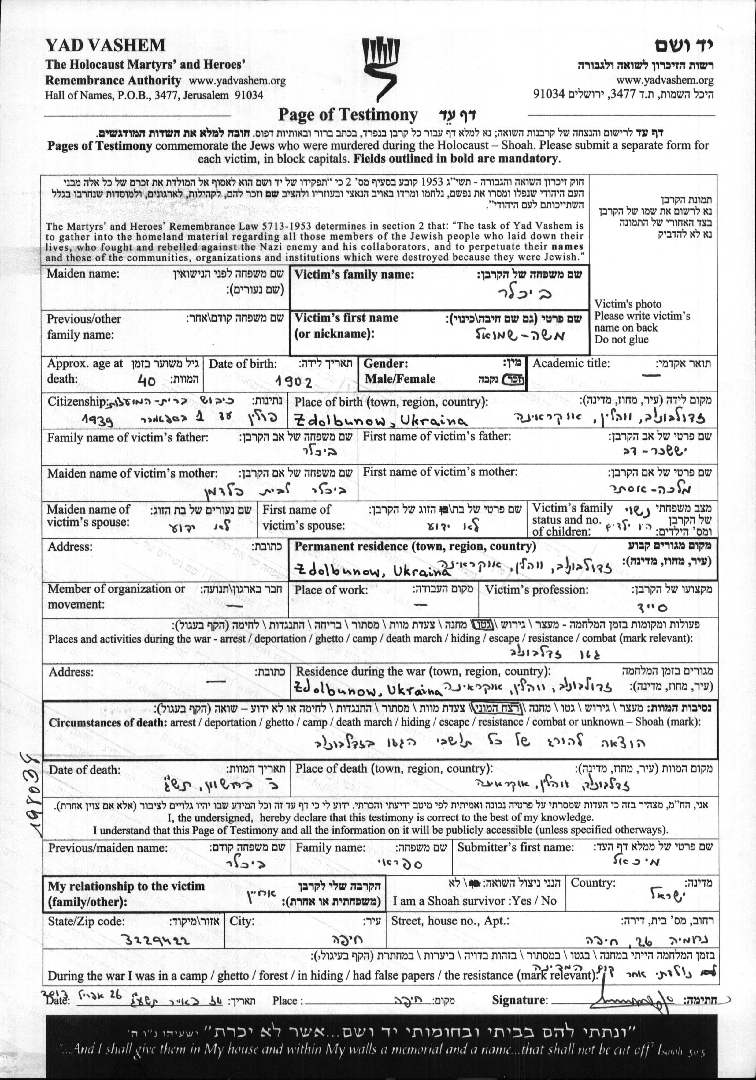 Бихлер Моше Шмуэль 1902 Здолбунов, Польша Лист свидетельских показаний