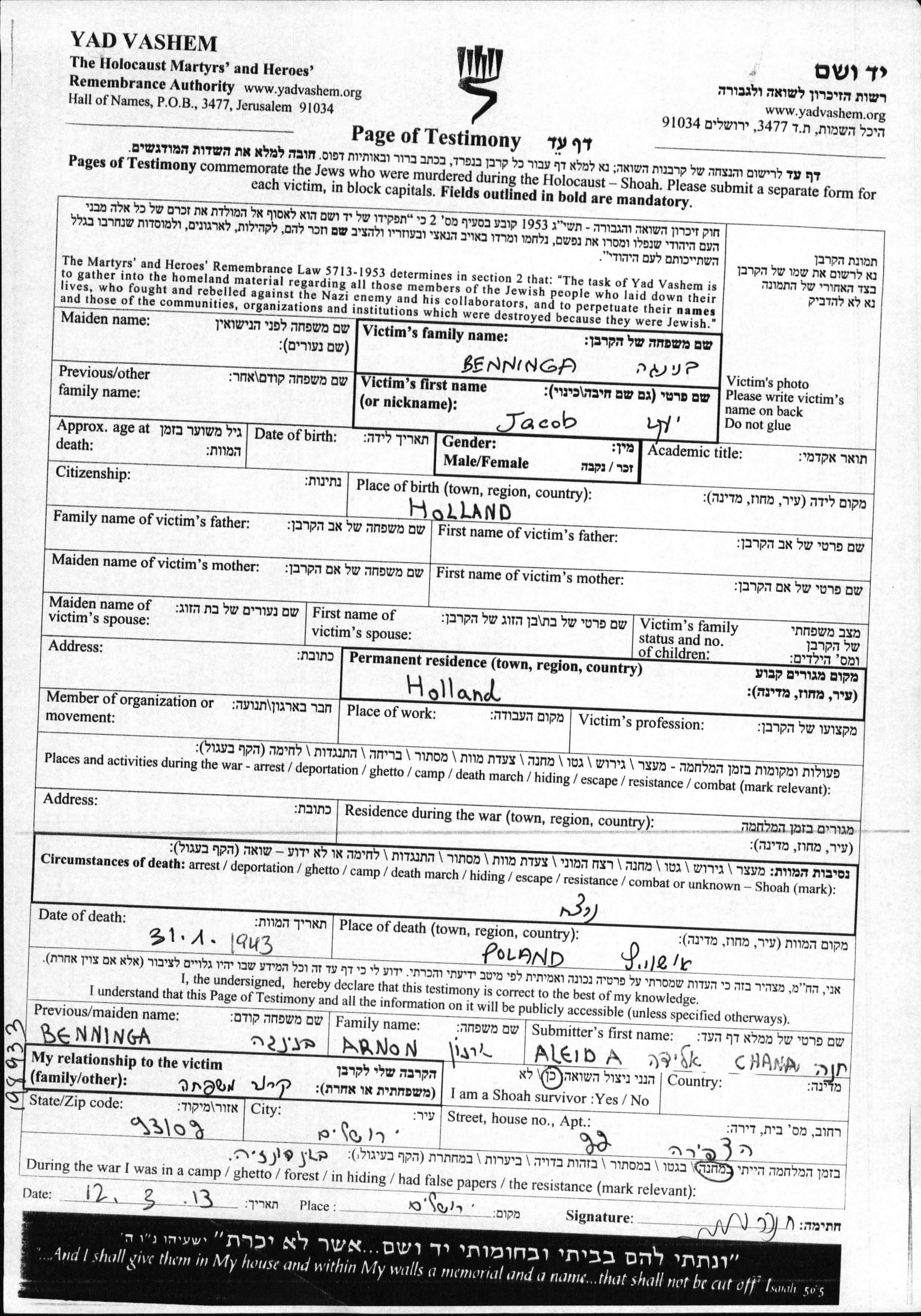 Якоб Беннинга, место рождения: Нидерланды. Место жительства до войны: Нидерланды. Место во время войны: Нидерланды.