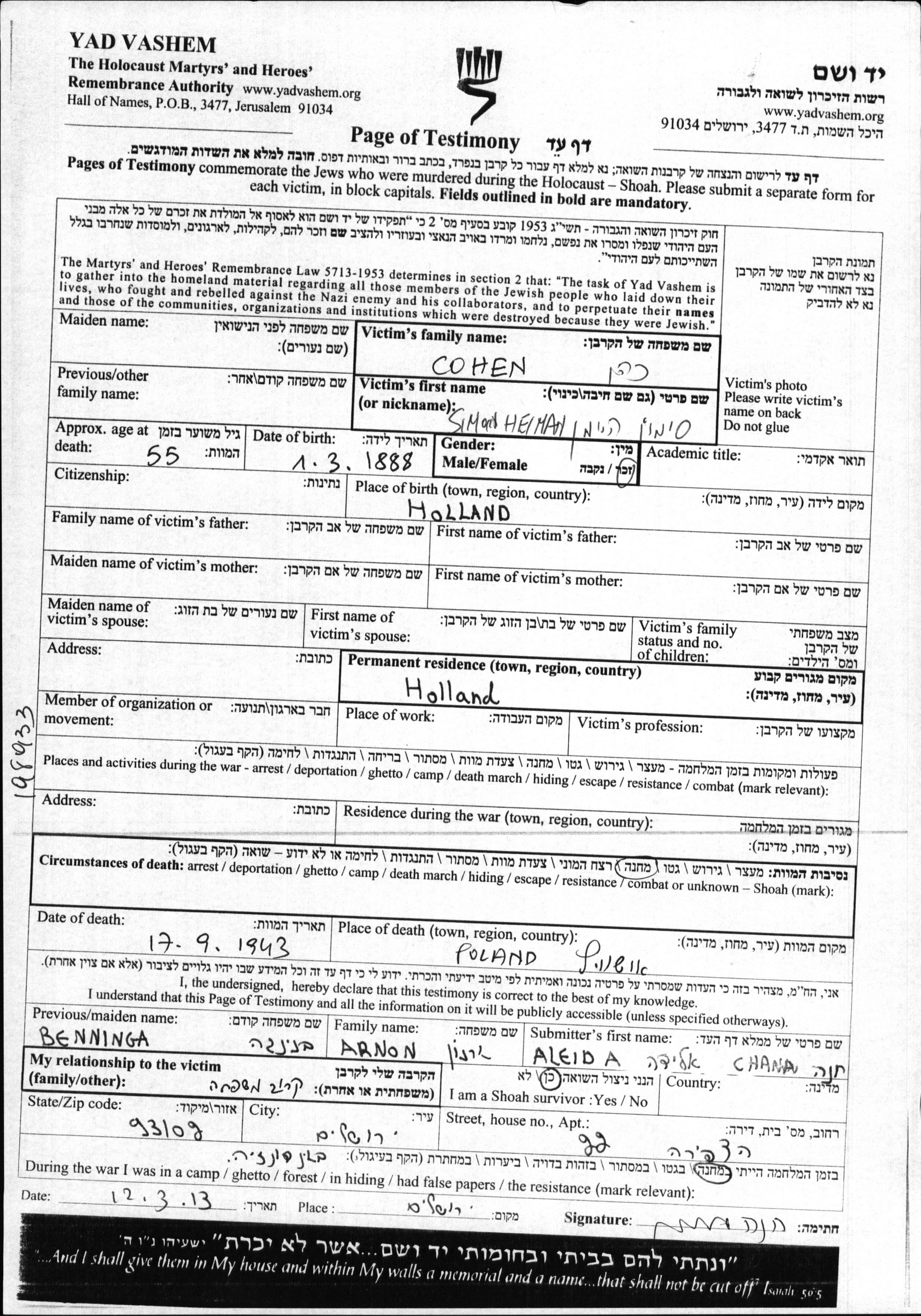 Симон Хейман Коэн, место рождения: Нидерланды. Место жительства до войны: Нидерланды. Место во время войны: Нидерланды.