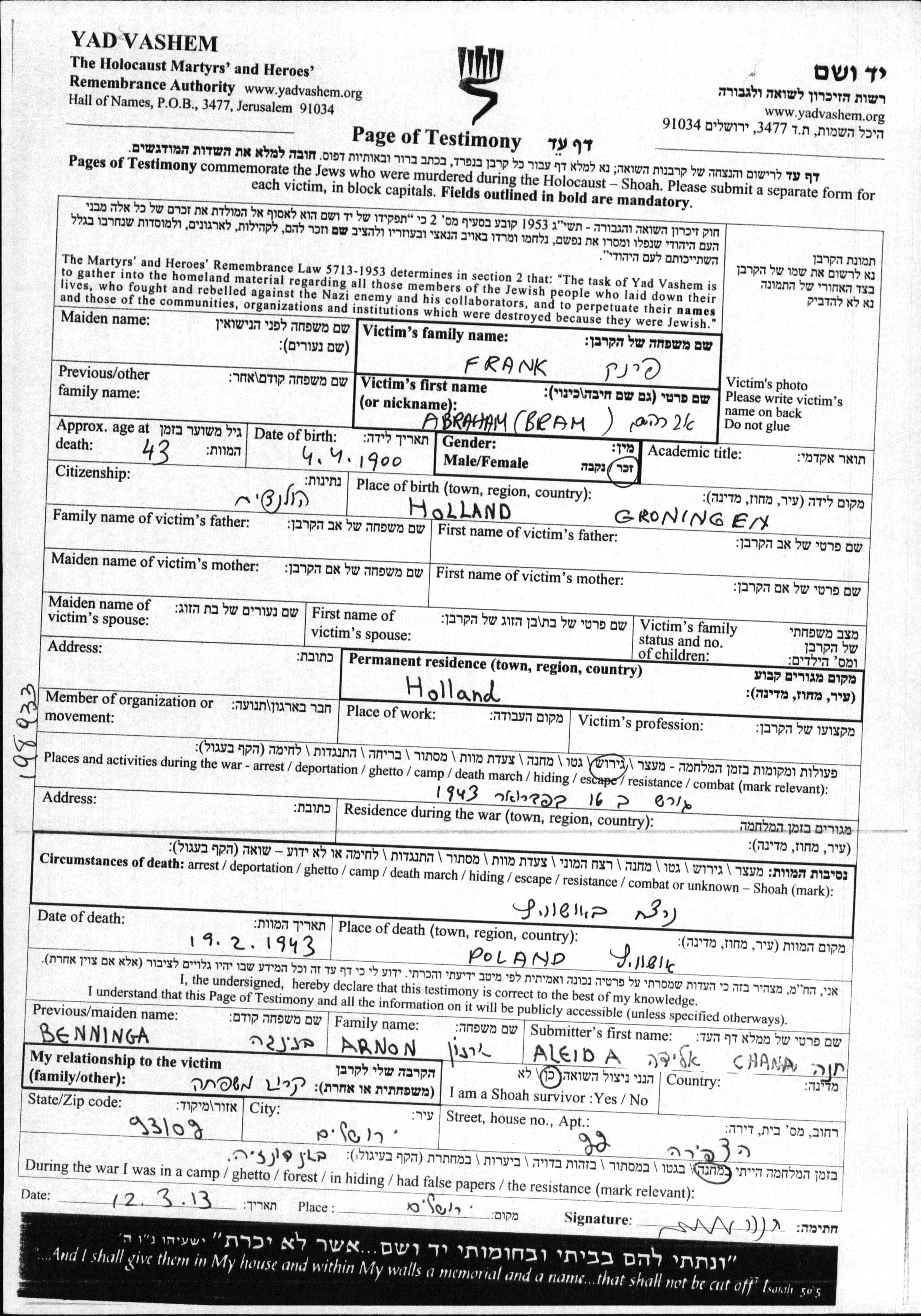 Абраам Франк, место рождения: Гронинген, Нидерланды. Место жительства до войны: Нидерланды. Место во время войны: Нидерланды.