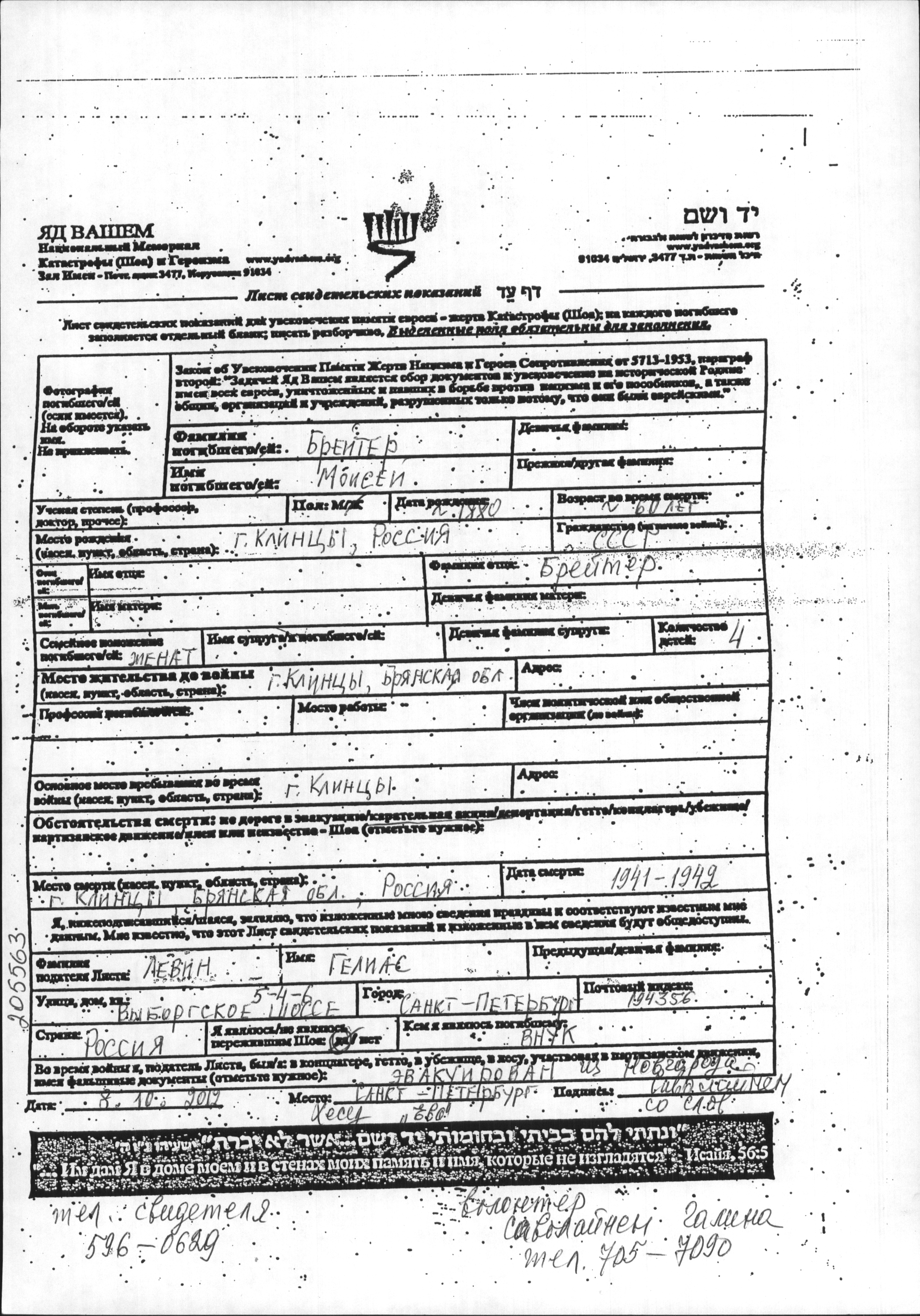 Моисей Брейтер, место рождения: Клинцы, Россия (СССР). Женат / замужем. Место жительства до войны: Клинцы, Россия (СССР). Место во время войны: Клинцы, Россия (СССР).
