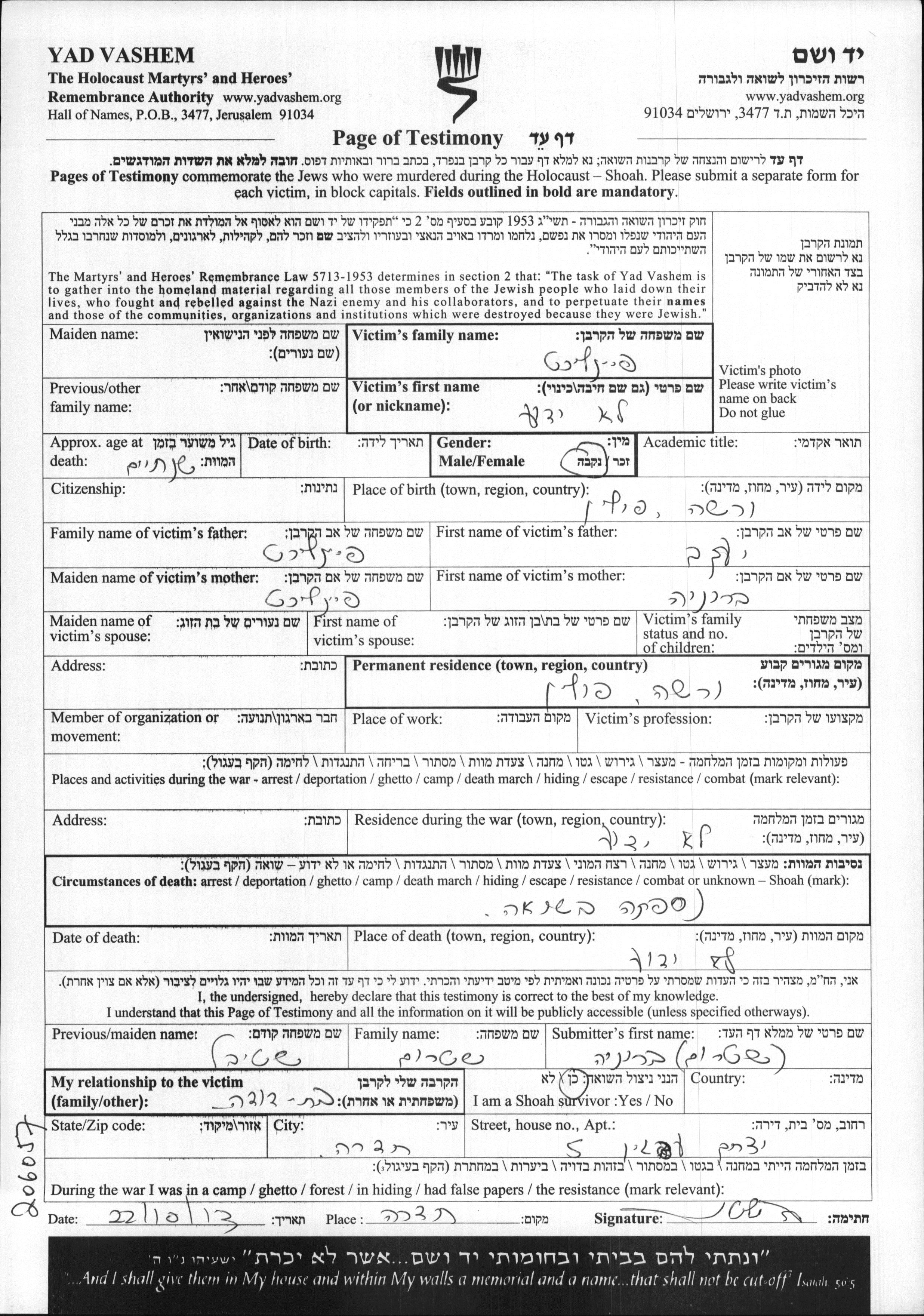Яд Вашем - Листы свидетельских показаний Мемориального фонда