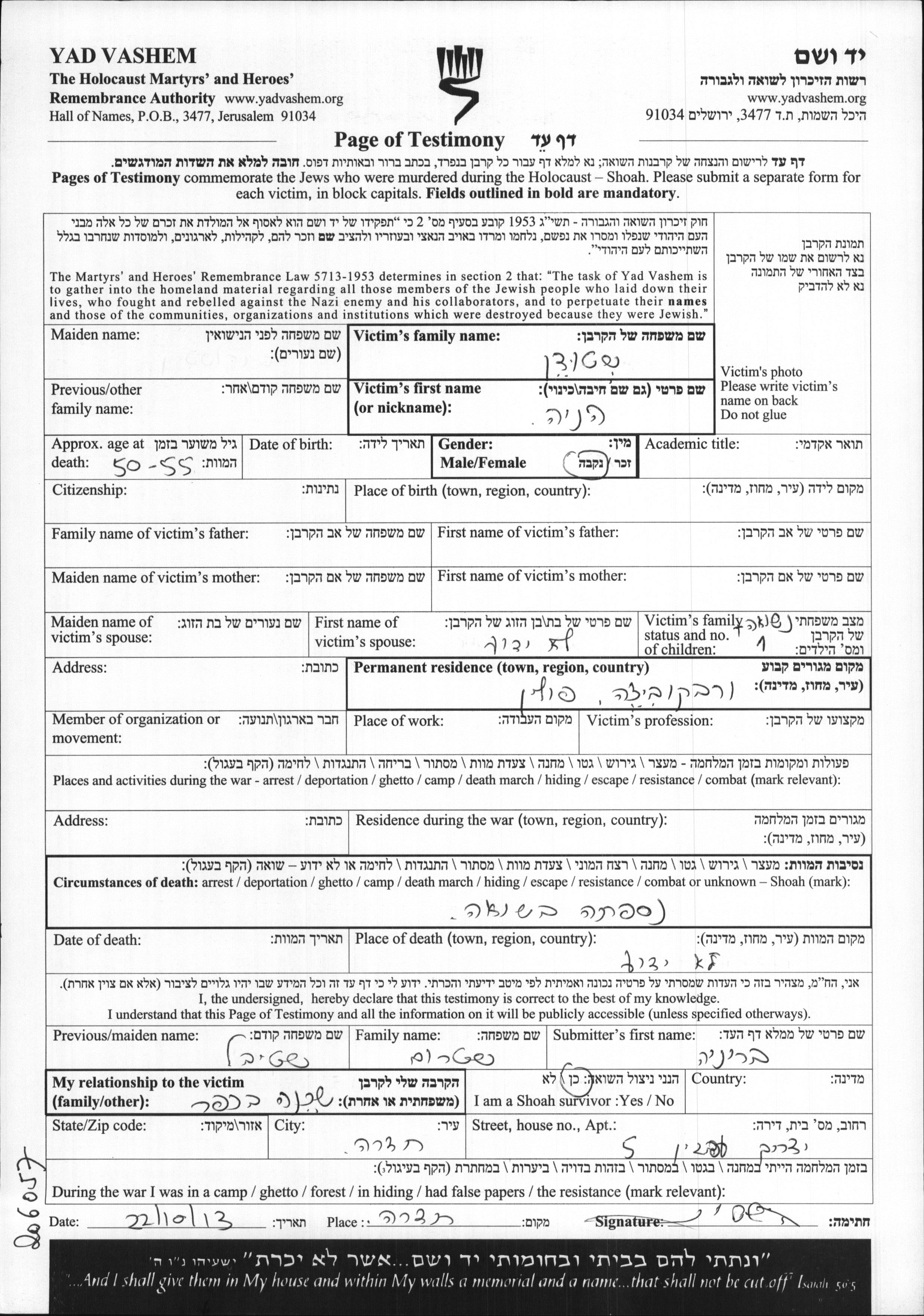 Яд Вашем - Листы свидетельских показаний Мемориального фонда