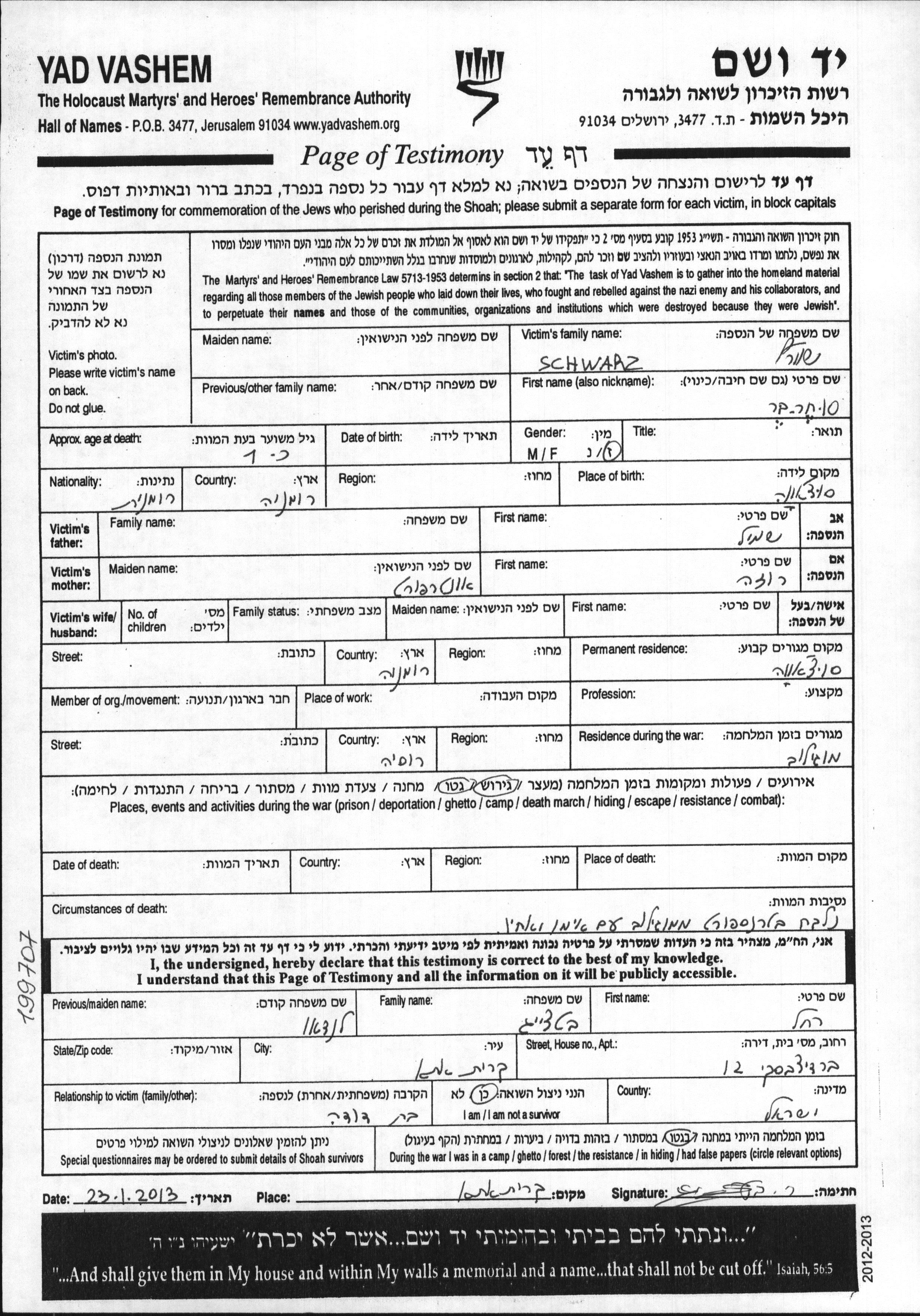 Шварц Сухер Бер Сучава, Румыния Лист свидетельских показаний