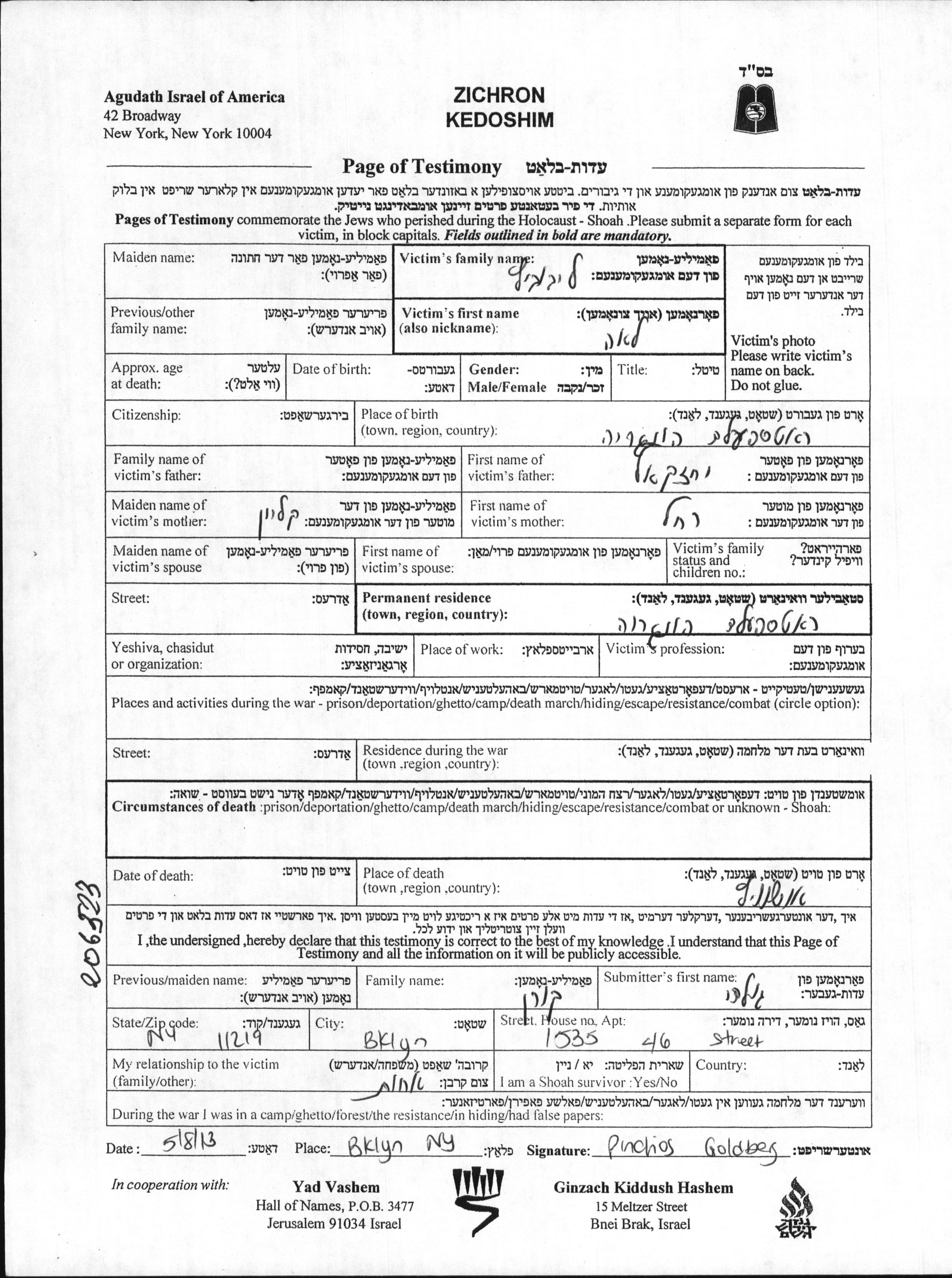 Яд Вашем - Листы свидетельских показаний Мемориального фонда