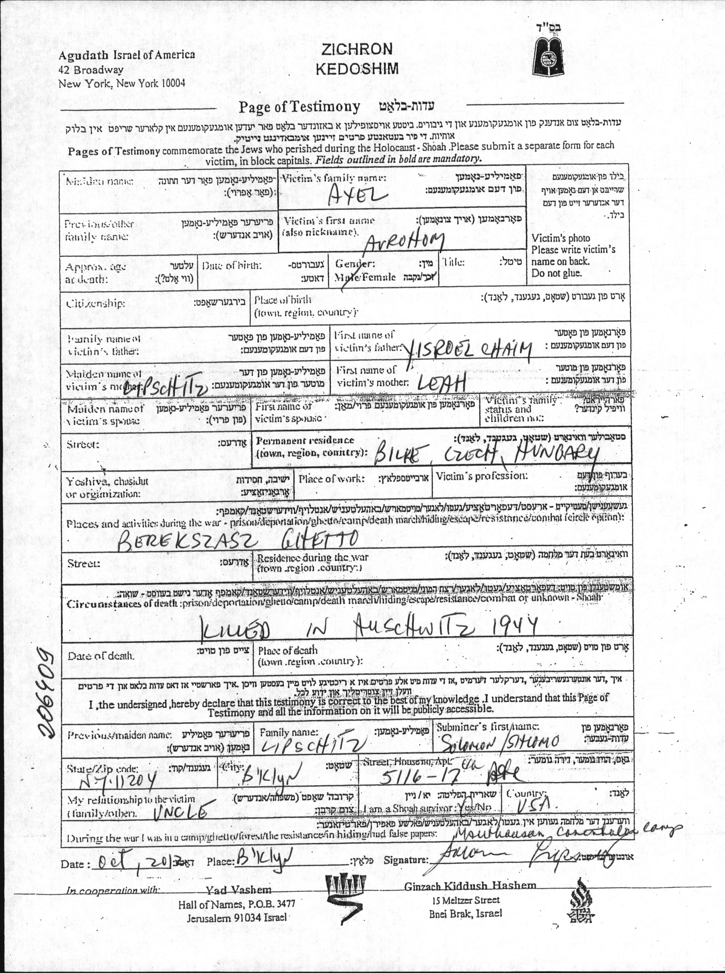Аврохом Аксель Исроэль Хаим Лея девичья фамилия Липшиц. Место жительства до войны: Бильке, Чехословакия. Место во время войны: Берегсас, Чехословакия.