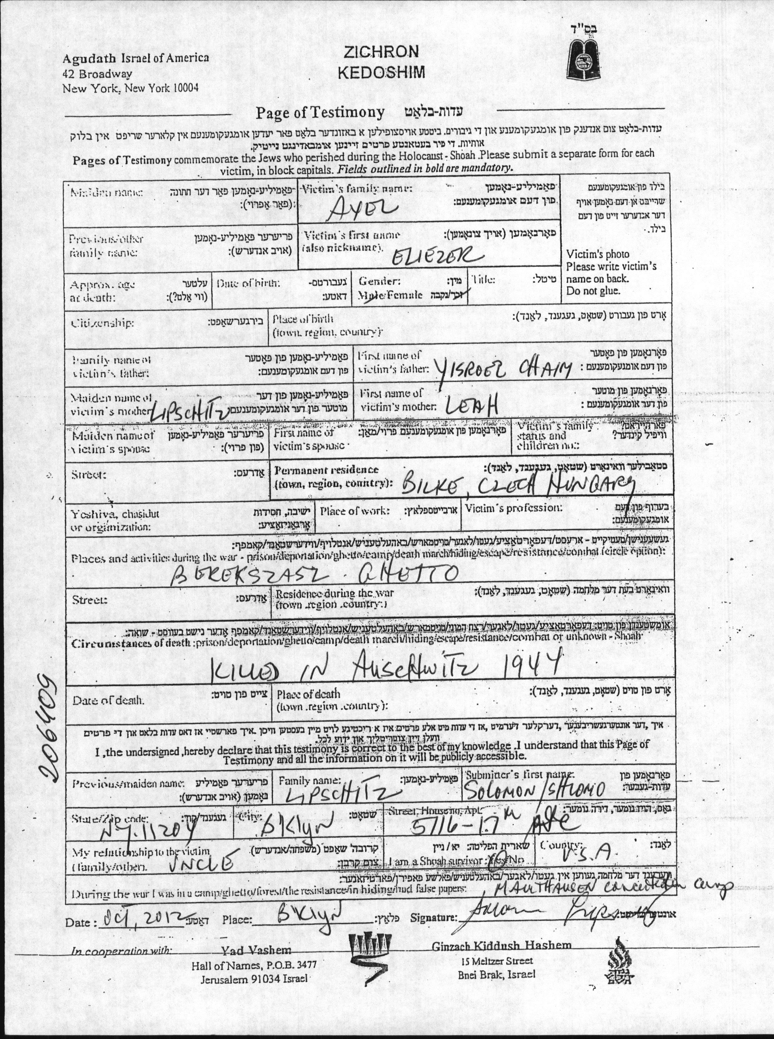 Элиэзер Аксель Исроэль Хаим Лея девичья фамилия Липшиц. Место жительства до войны: Бильке, Чехословакия. Место во время войны: Берегсас, Чехословакия.