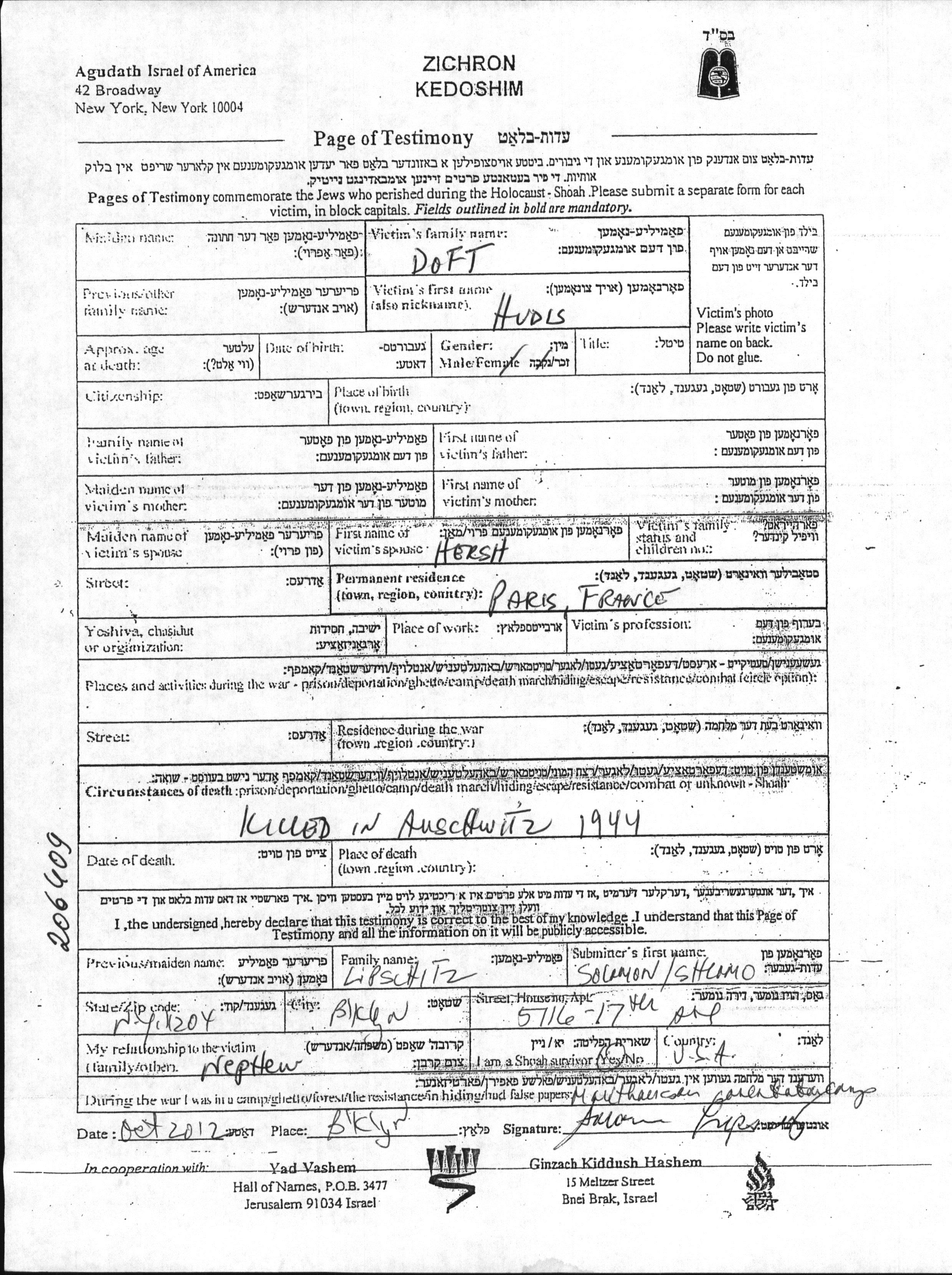 Худес Дофт. Женат / замужем. Место жительства до войны: Париж, Франция. Место во время войны: Франция.