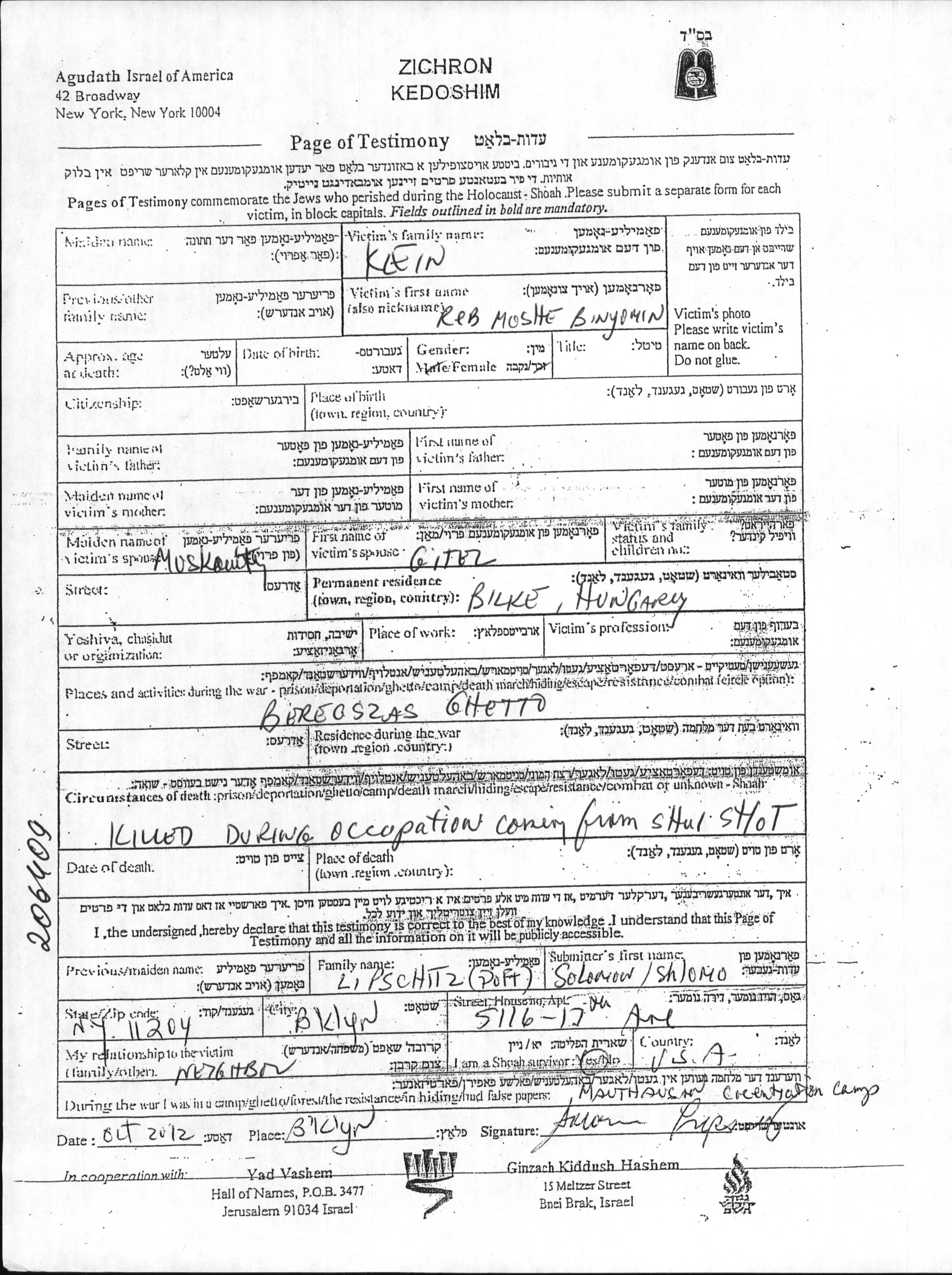Моше Биньомин Кляйн. Женат / замужем. Место жительства до войны: Бекень, Чехословакия. Место во время войны: Берегсас, Чехословакия.