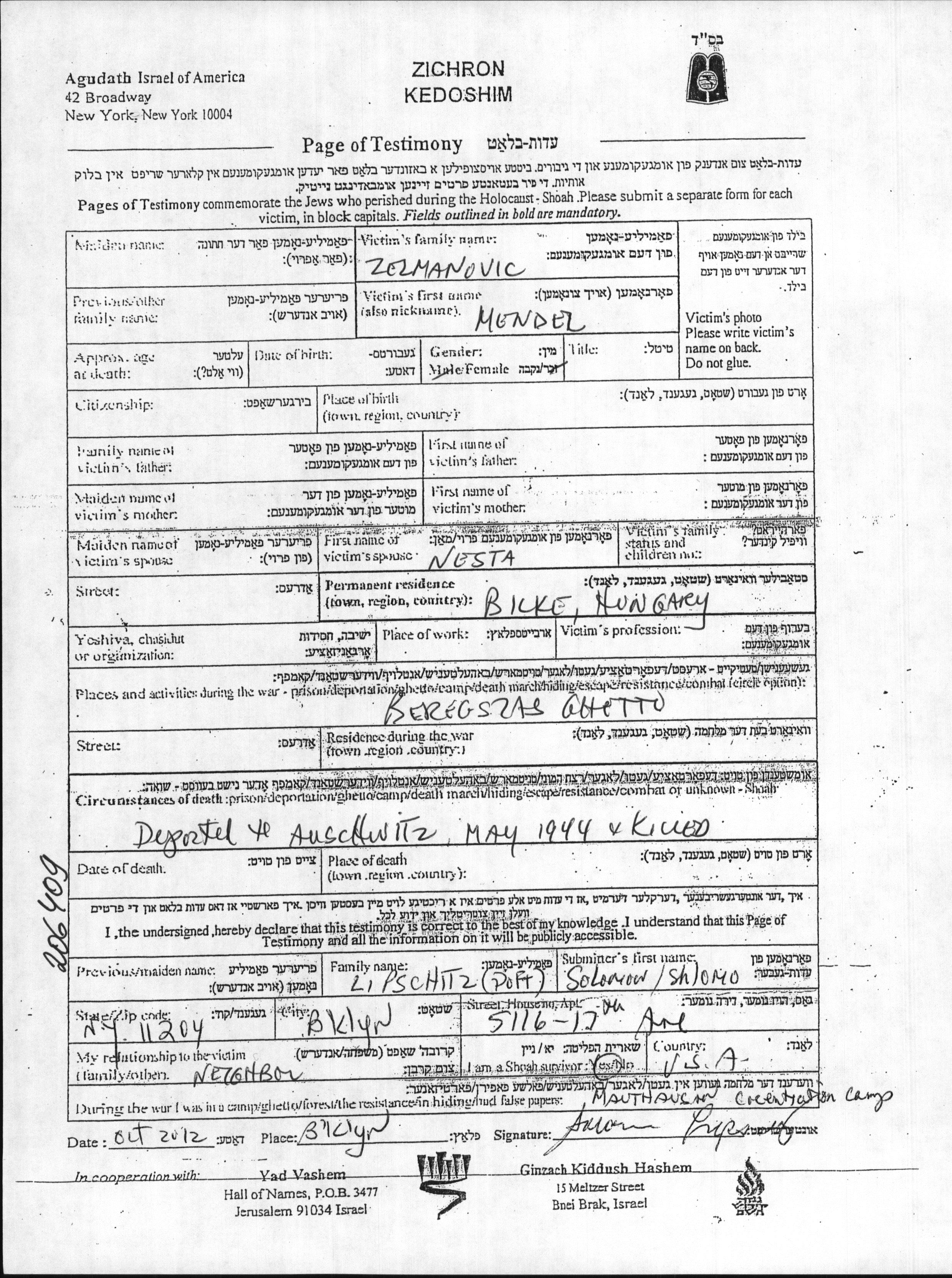Мендель Зельманович. Женат / замужем. Место жительства до войны: Бильке, Чехословакия. Место во время войны: Берегсас, Чехословакия.