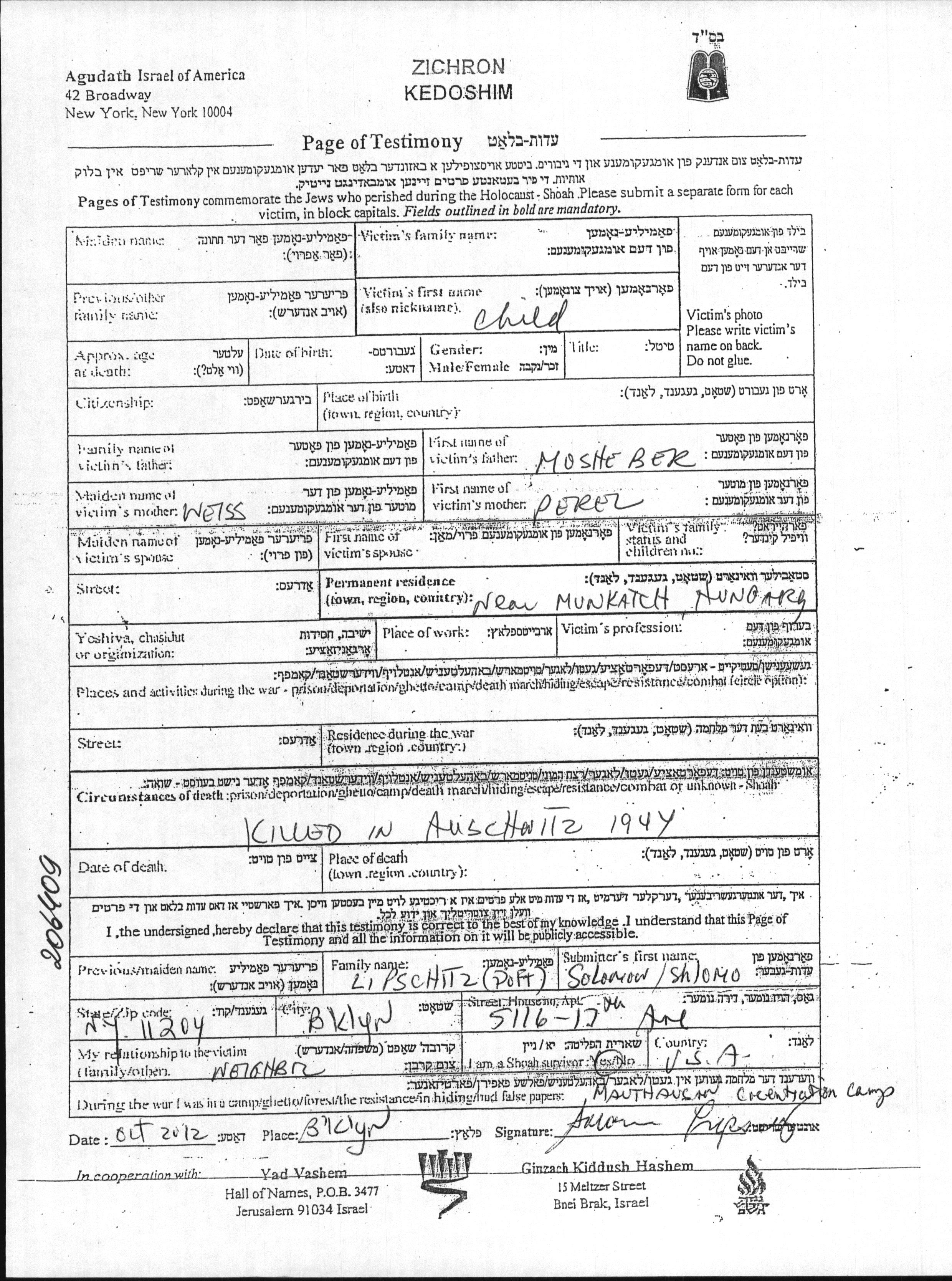Имя неизвестно Фамилия неизвестна родился/родилась Моше Бер Перец девичья фамилия Вайсс. Ребенок. Место жительства до войны: Мункач, Чехословакия.