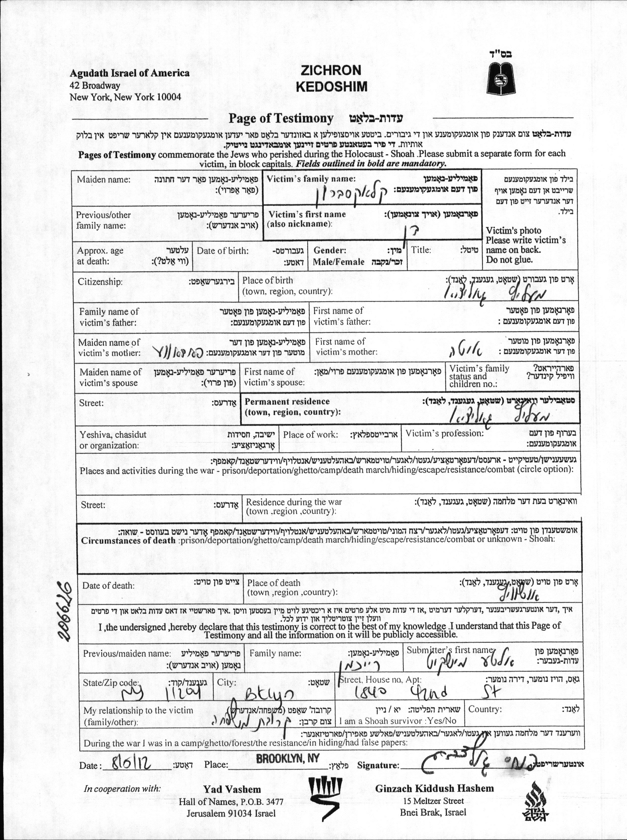 Имя неизвестно Клаксбрун, место рождения: Мелич, Польша.Mать:Ита, девичья фамилия Падове. Место жительства до войны: Мелич, Польша.