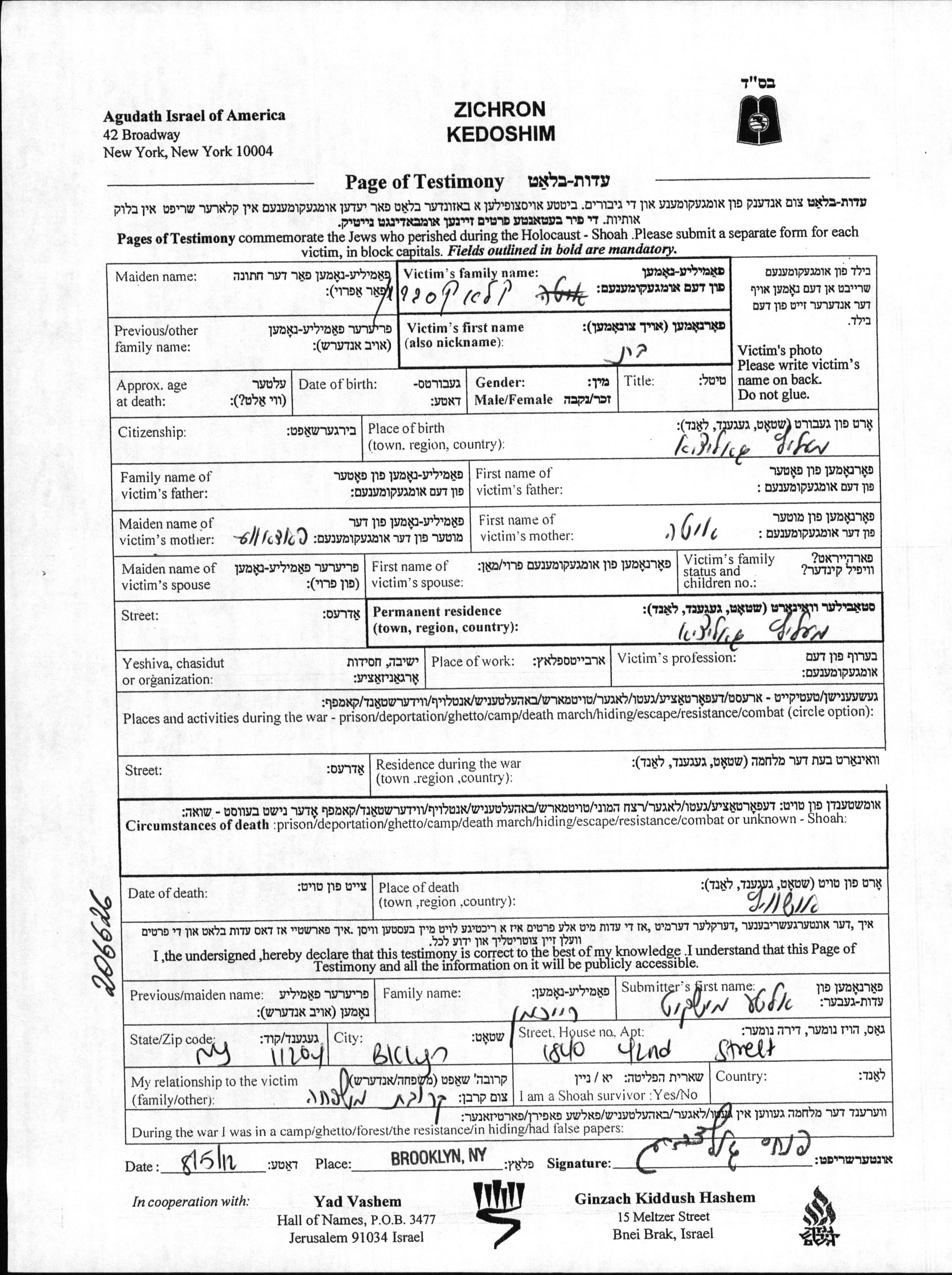 Яд Вашем - Листы свидетельских показаний Мемориального фонда