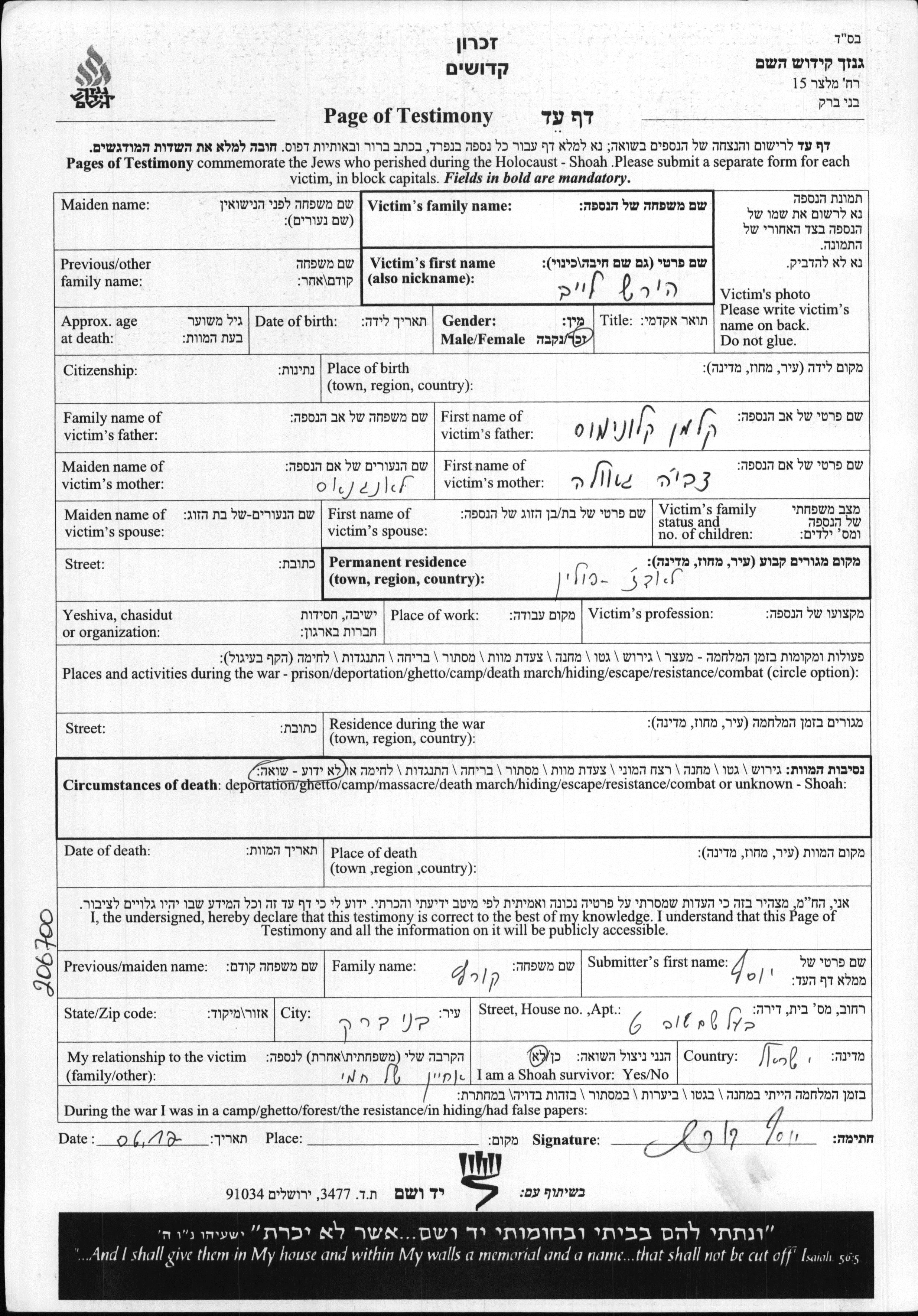 Фамилия неизвестна Хирш Лейб Лодзь, Польша Лист свидетельских показаний