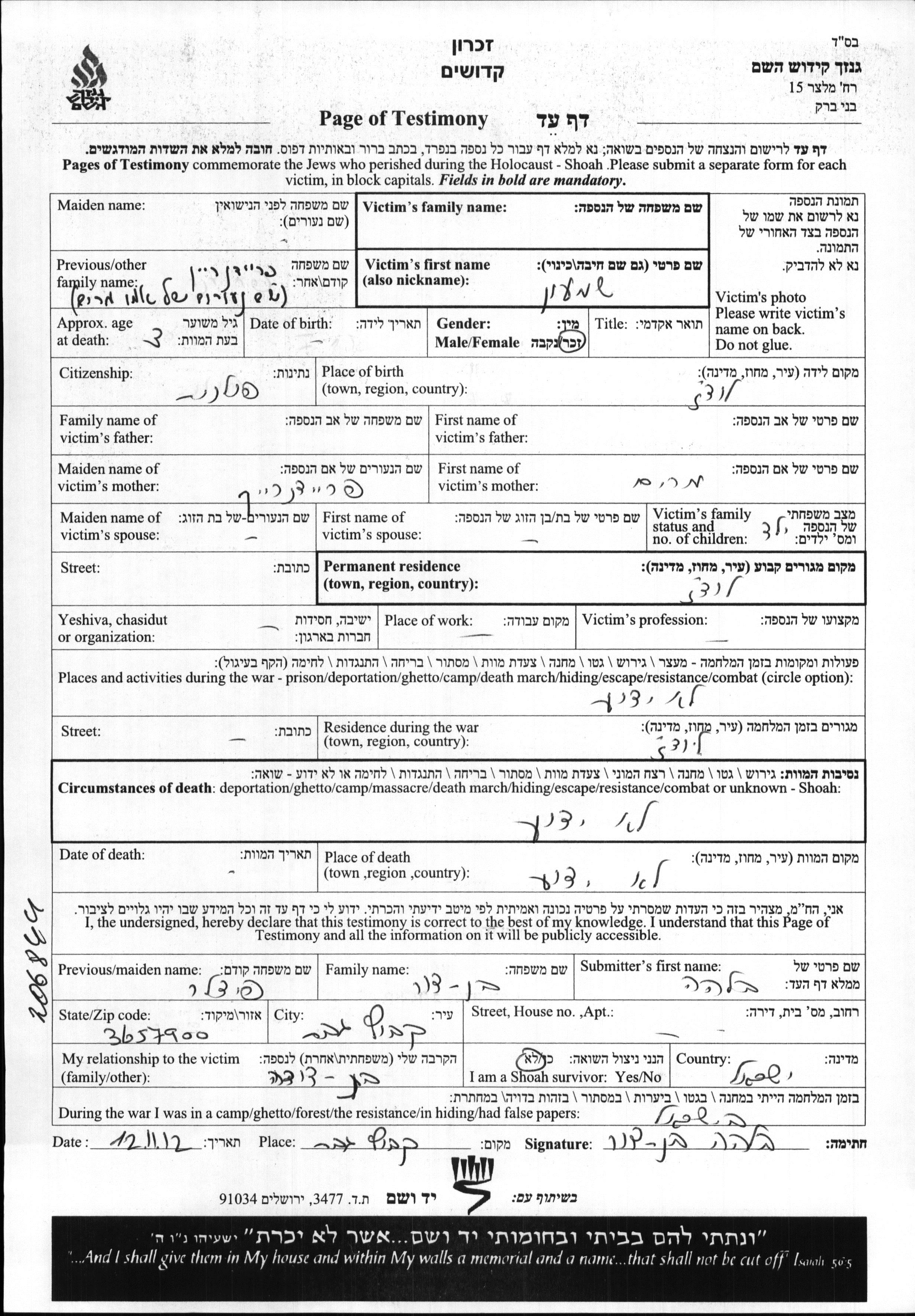 Фамилия неизвестна Шимон Лодзь, Польша Лист свидетельских показаний