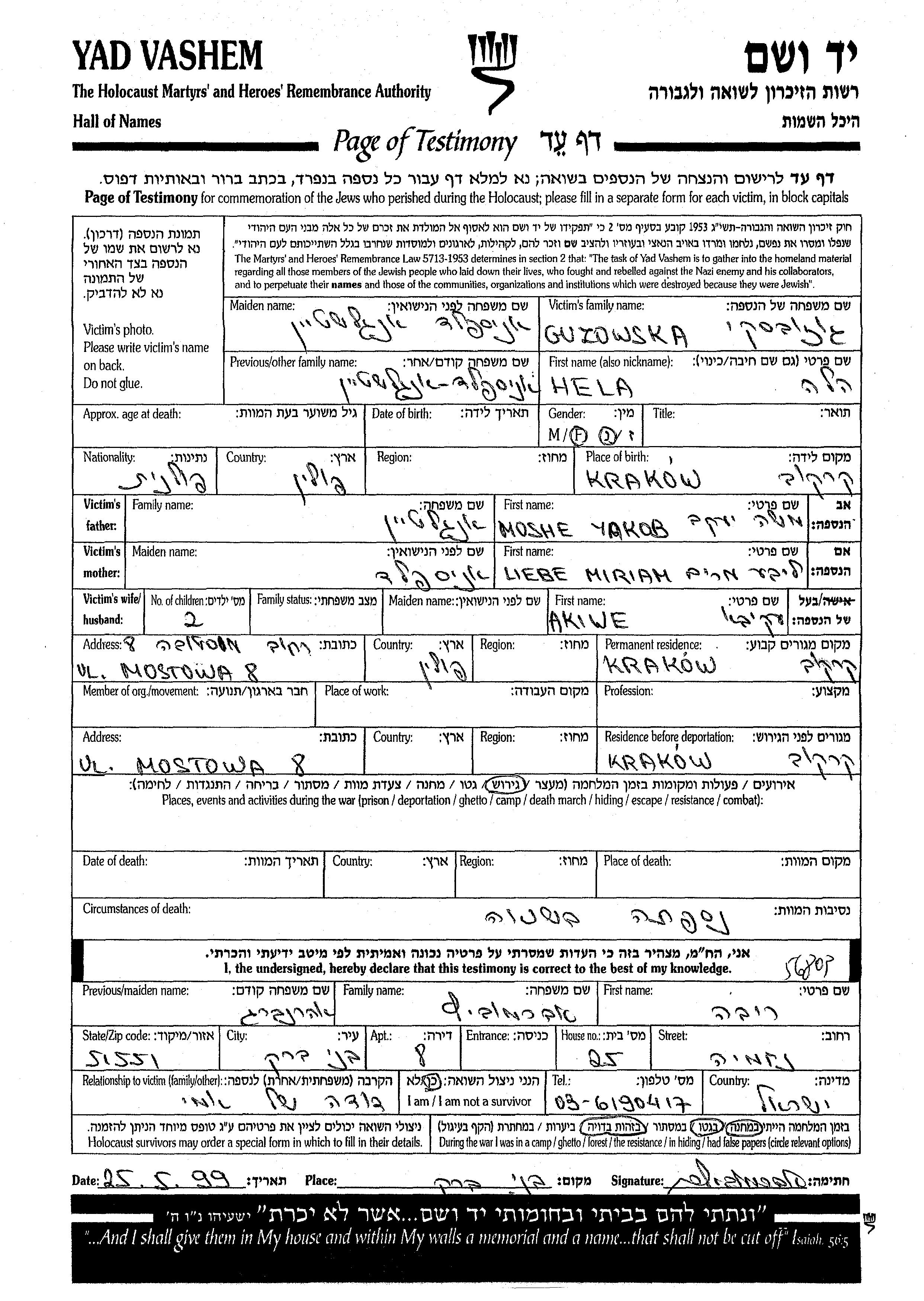Хела Гузовска Анисфельд, девичья фамилия Энгельштейн, место рождения: Краков, Польша. Отец: Моше Якоб, mать:Либе Мирьям. Женат / замужем. Место жительства до войны: Краков, Польша. Место во время войны: Краков, Польша.