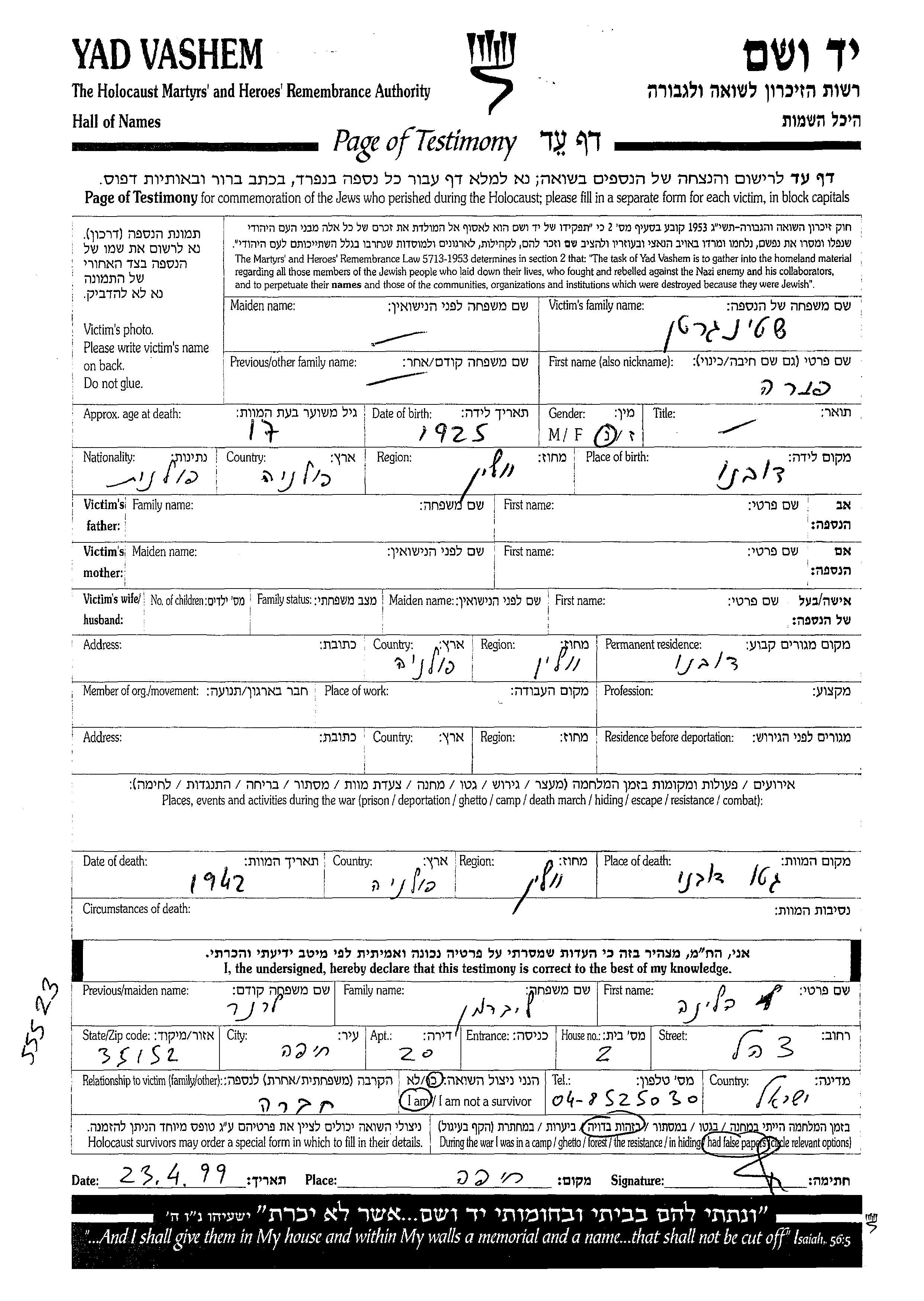Яд Вашем - Листы свидетельских показаний Мемориального фонда