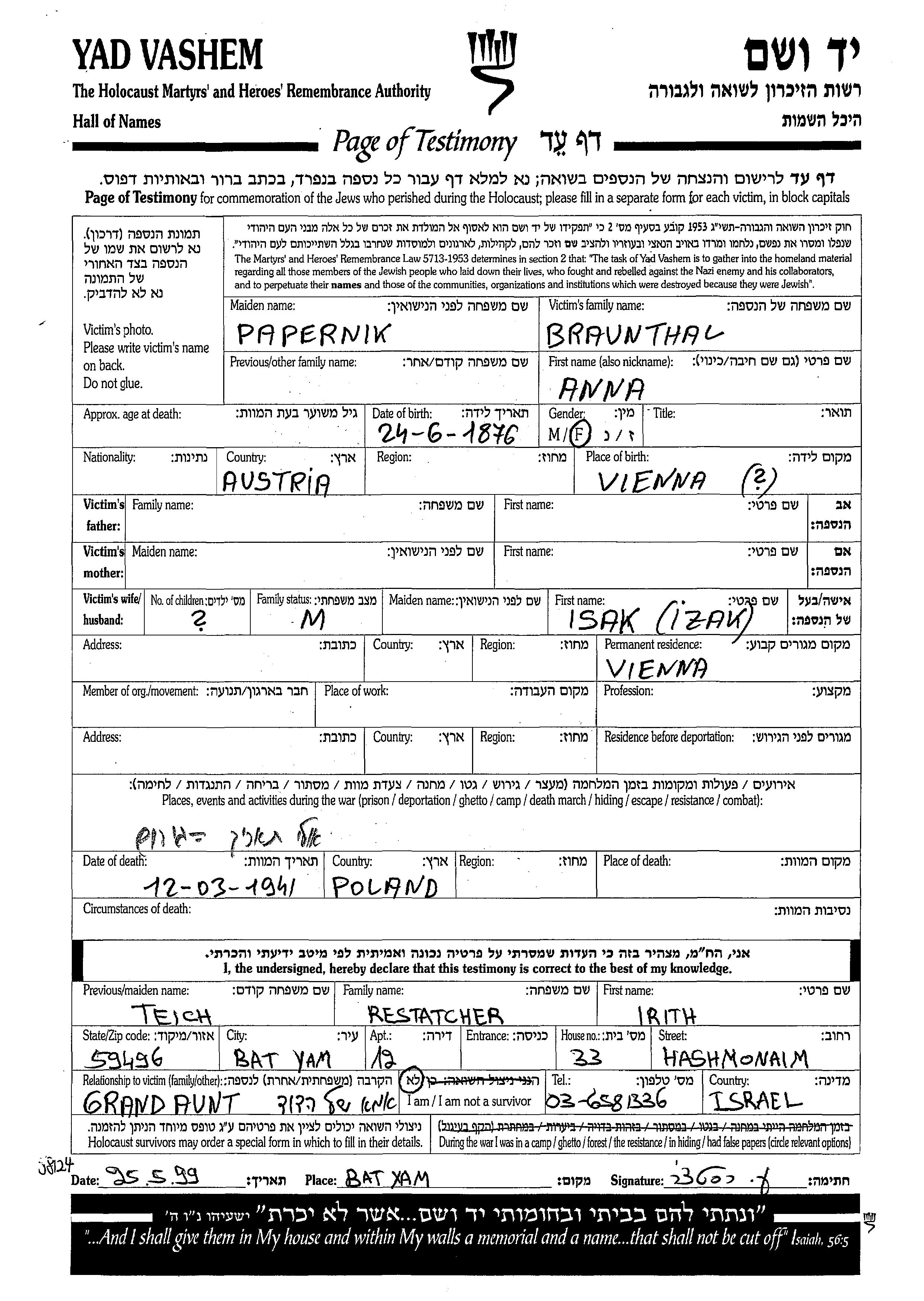 Анна Браунталь, девичья фамилия Паперник, место рождения: Вена, Австрия. Женат / замужем. Место жительства до войны: Вена, Австрия.