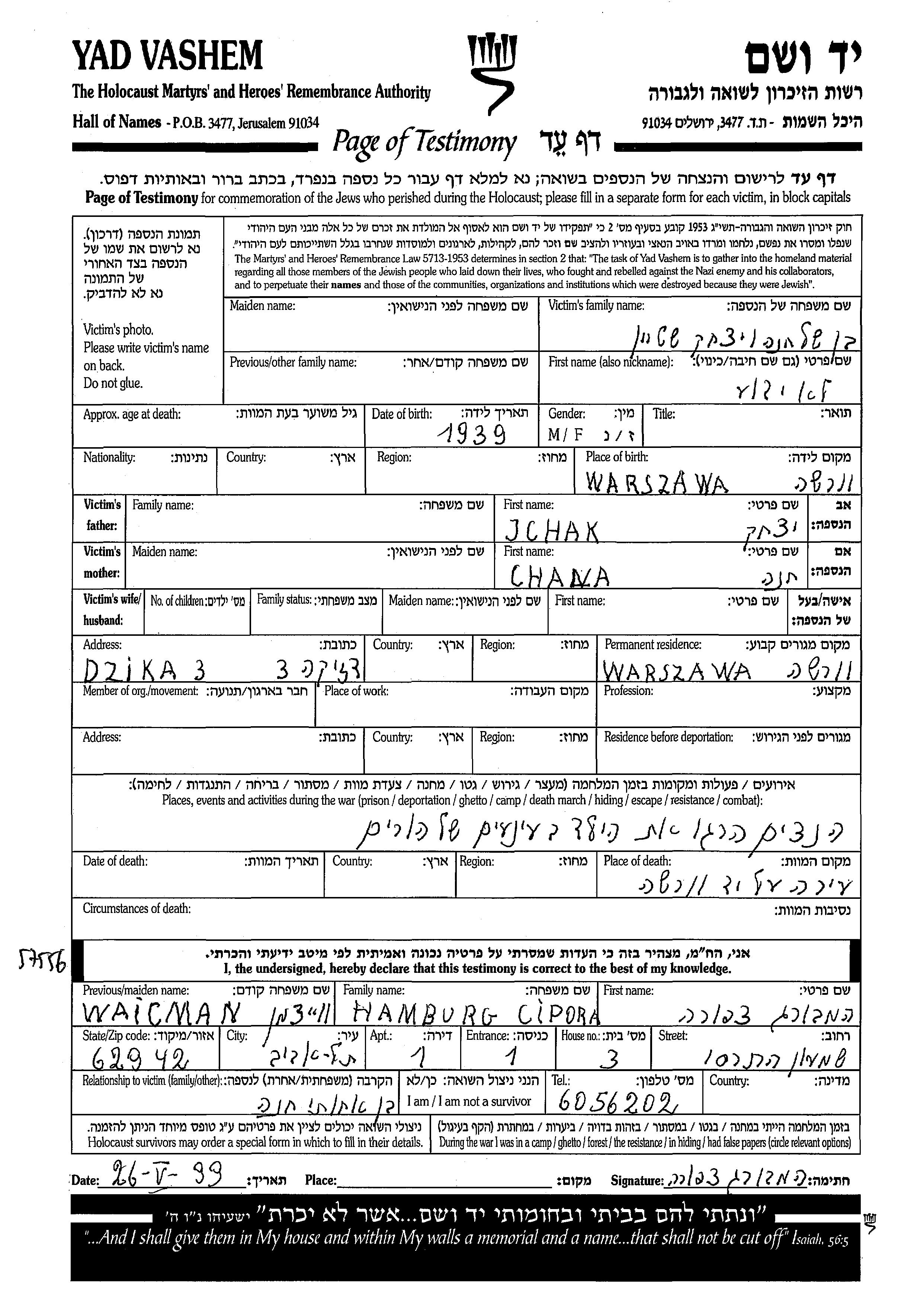 Штейн Имя неизвестно 1939 Варшава, Польша Лист свидетельских показаний