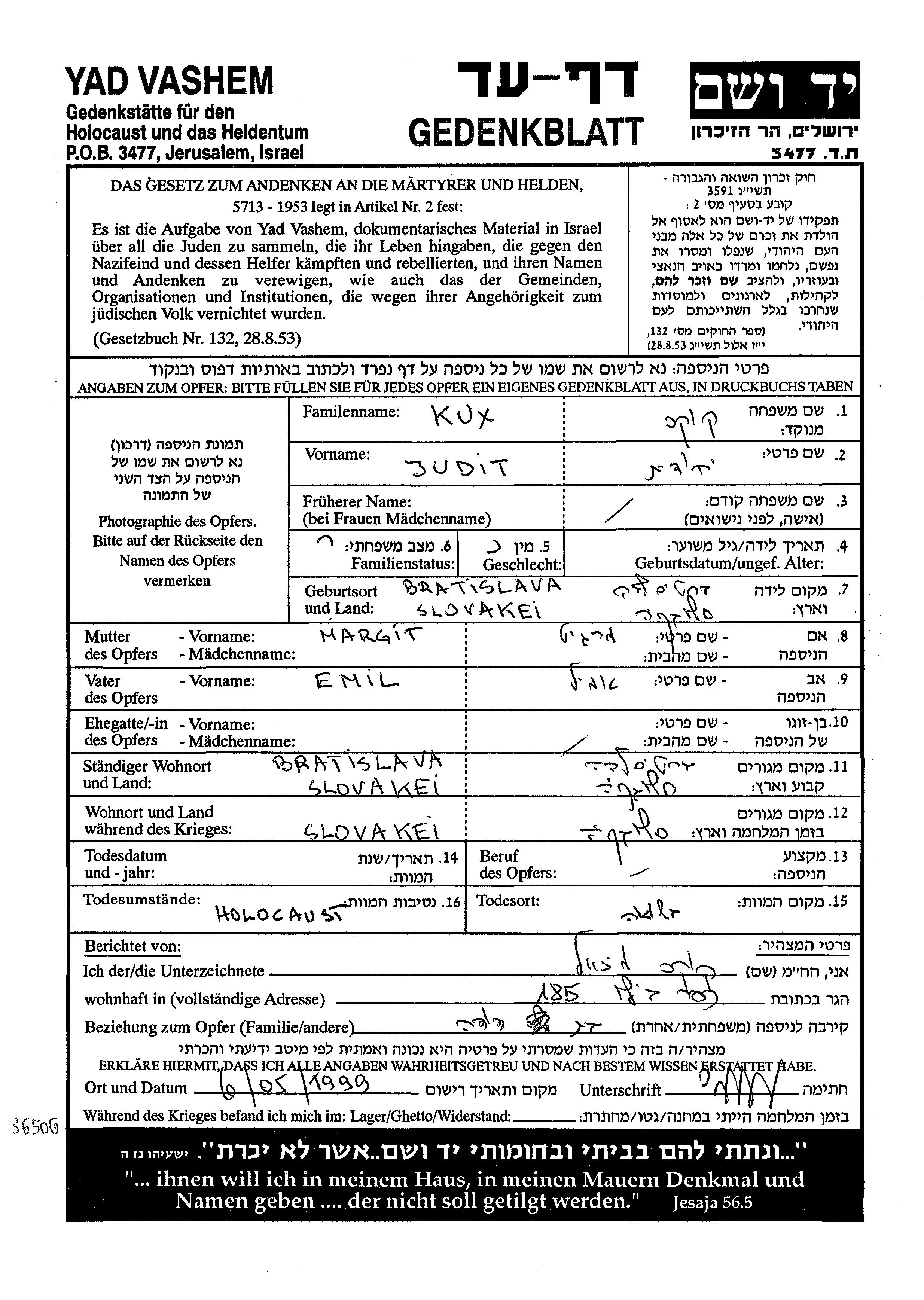 Юдит Кукс, место рождения: Братислава, Чехословакия. Отец: Эмиль, mать:Маргит. Холост / не замужем. Место жительства до войны: Братислава, Чехословакия. Место во время войны: Словакия, Чехословакия.