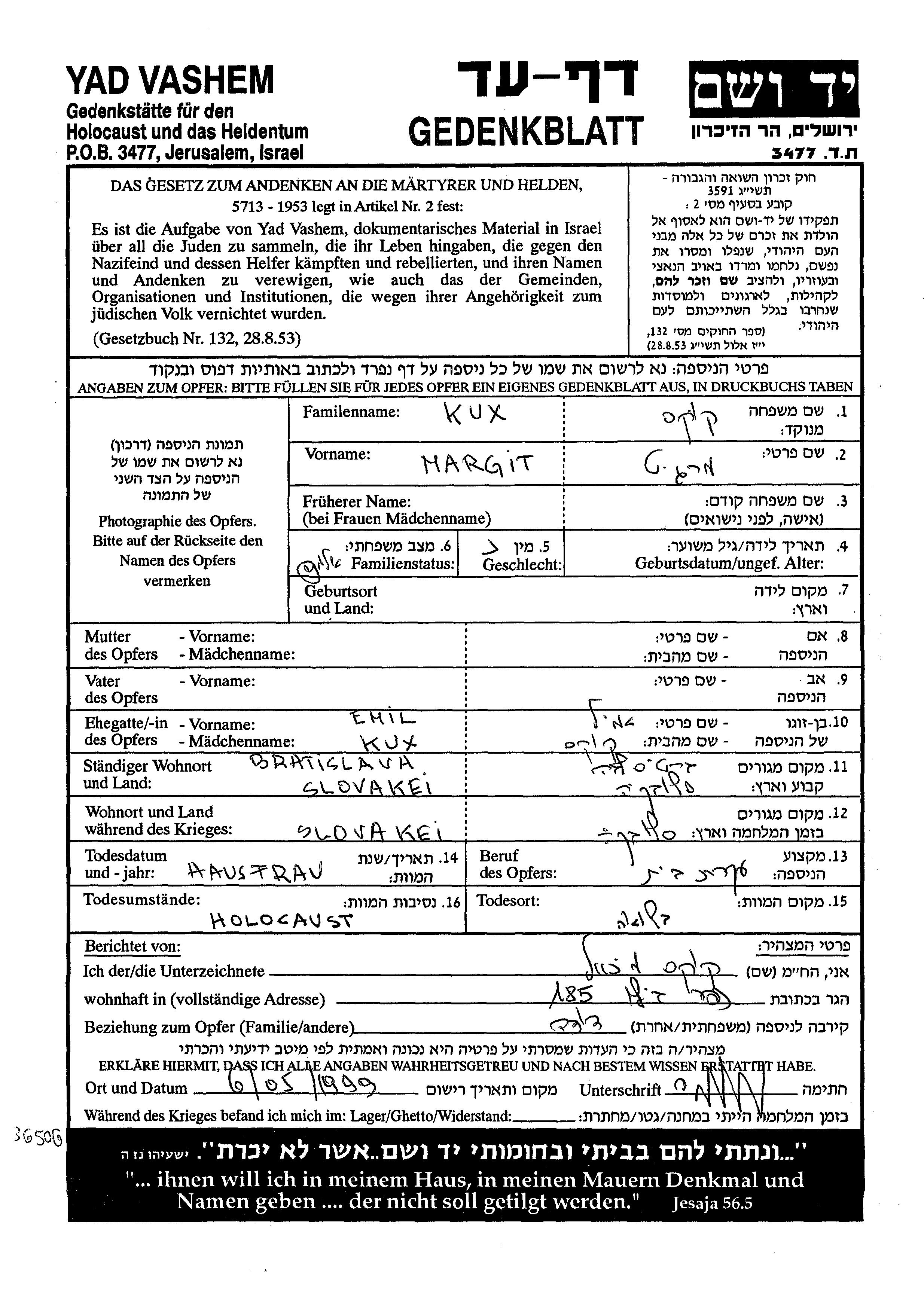 Кукс Маргит Братислава, Чехословакия Лист свидетельских показаний