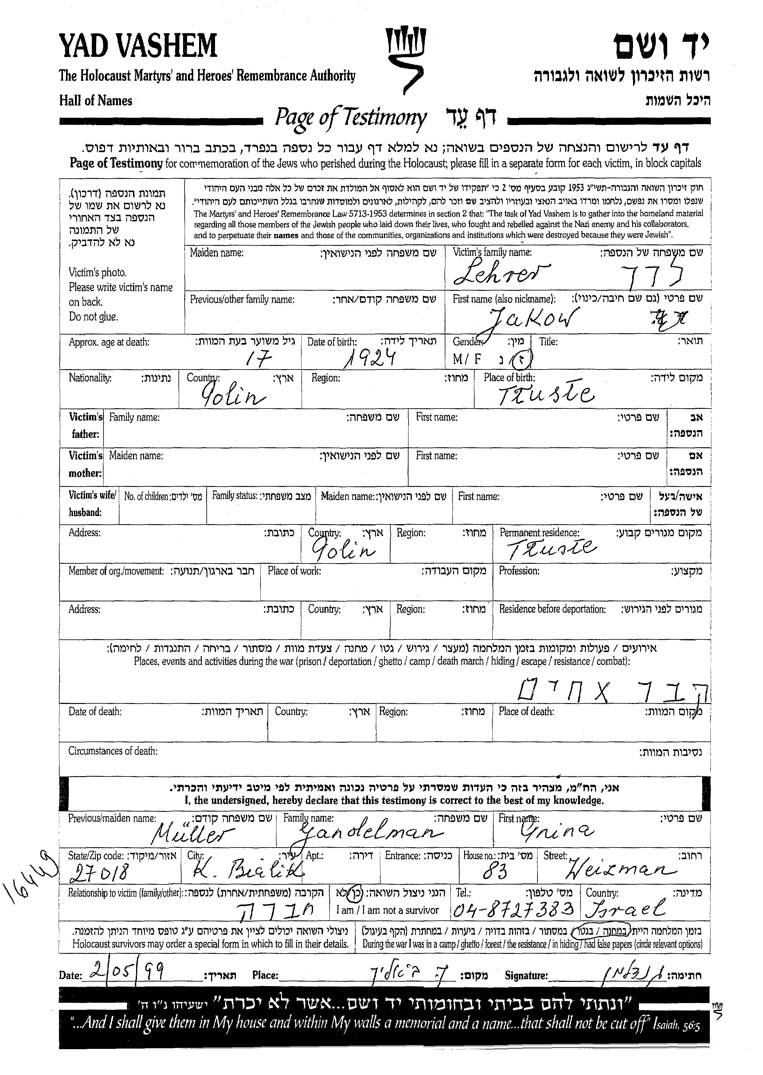 Лерер Яков 1924 Тлусте, Польша Лист свидетельских показаний
