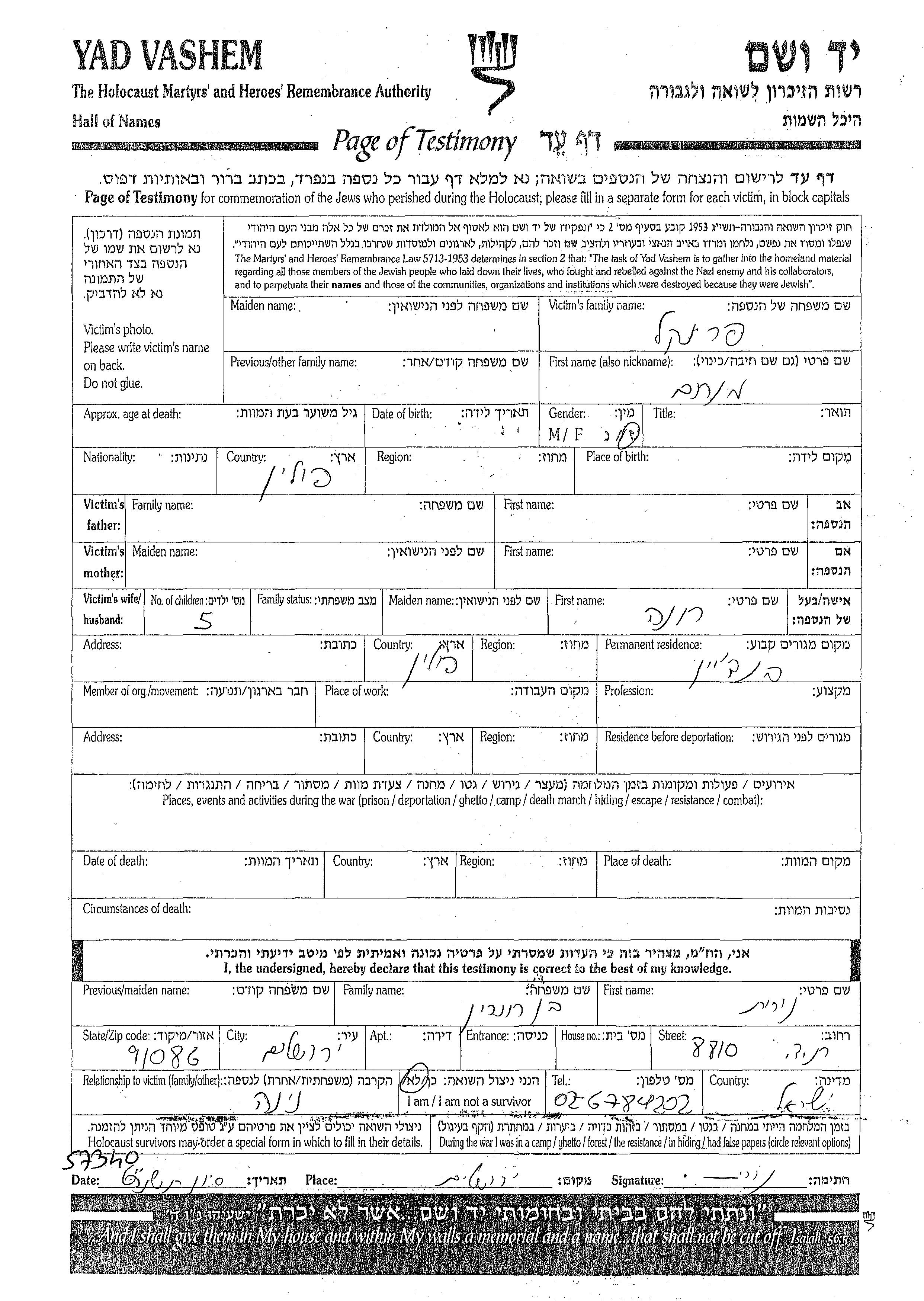 Яд Вашем - Листы свидетельских показаний Мемориального фонда