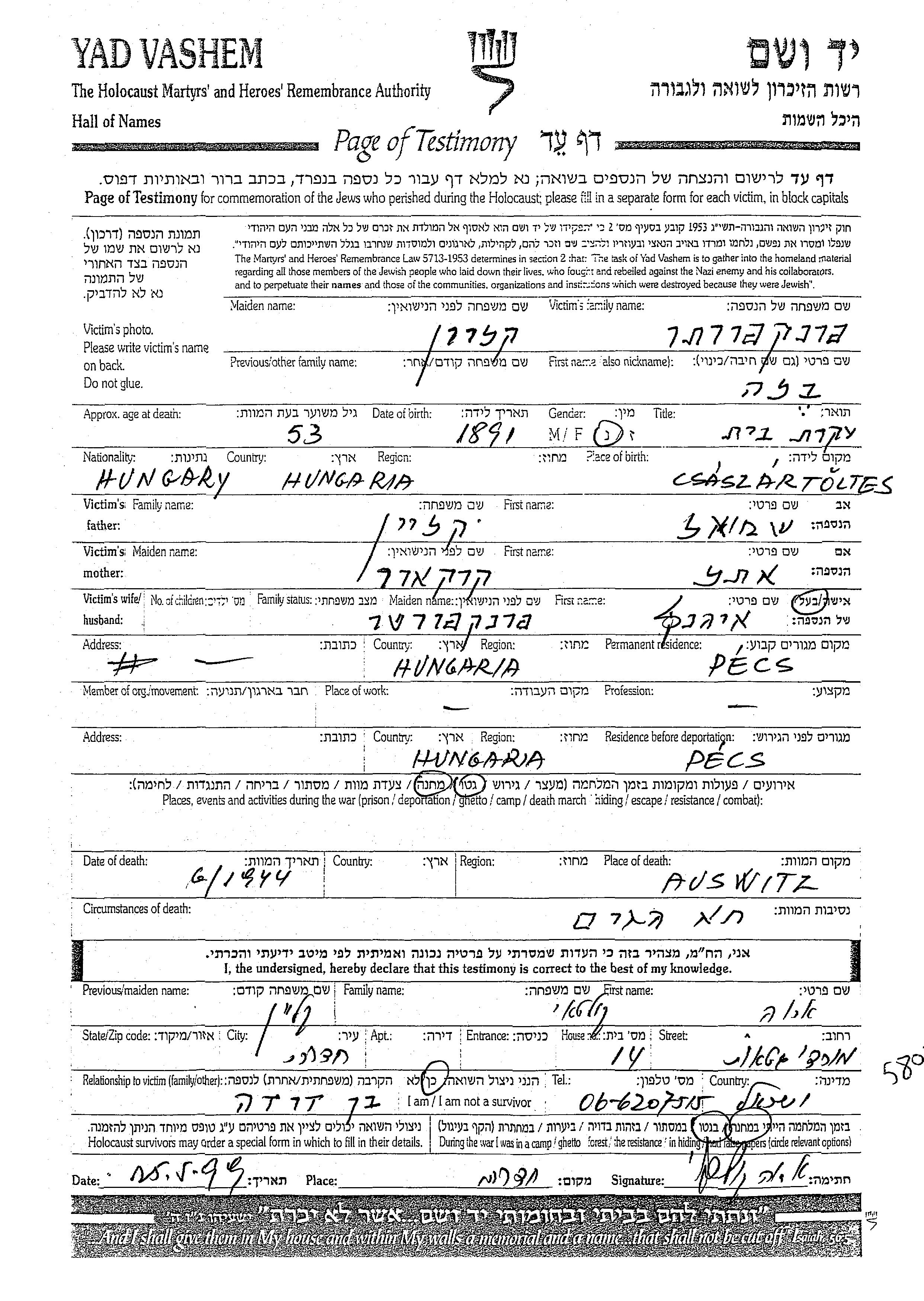Яд Вашем - Листы свидетельских показаний Мемориального фонда