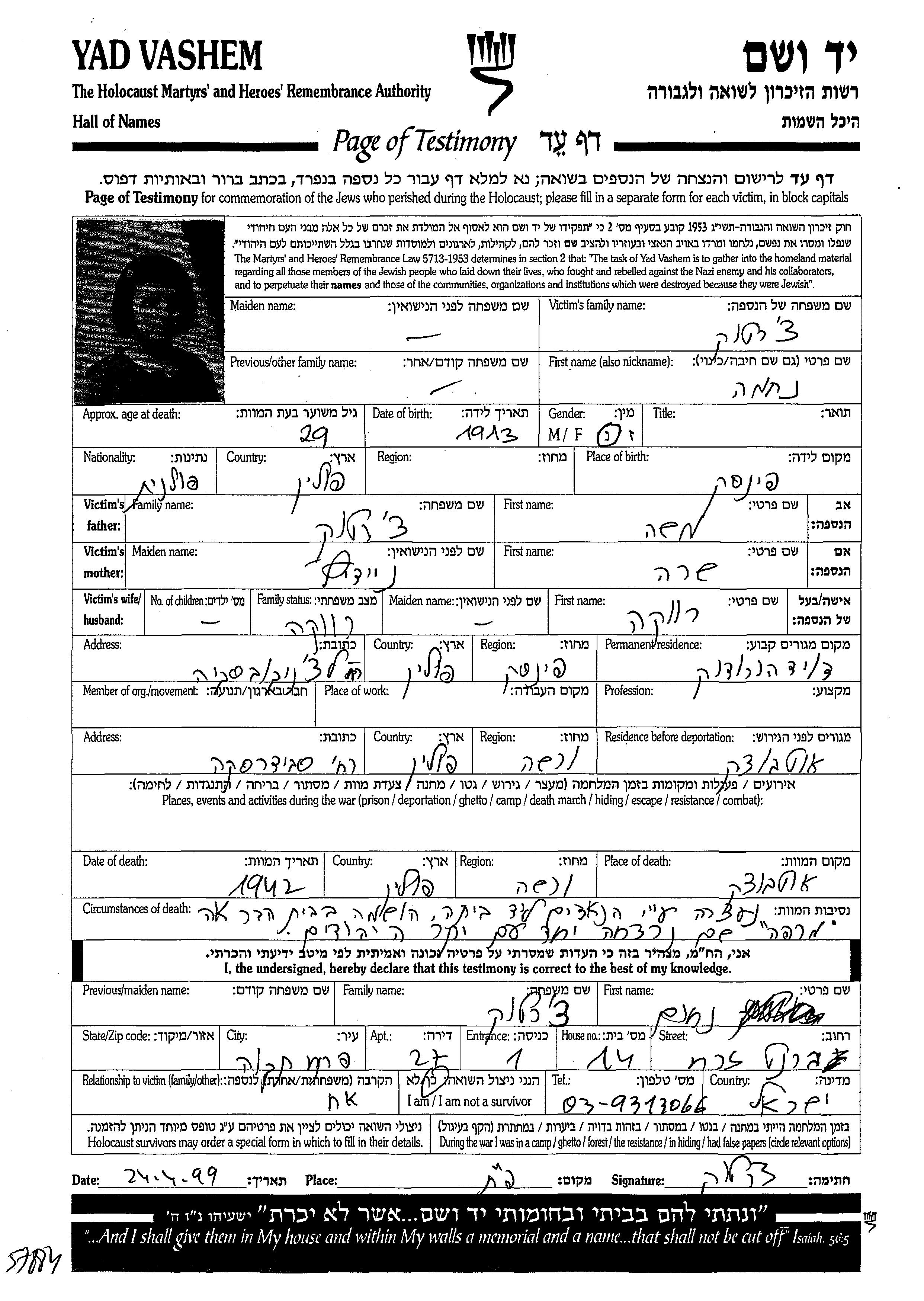 Яд Вашем - Листы свидетельских показаний Мемориального фонда