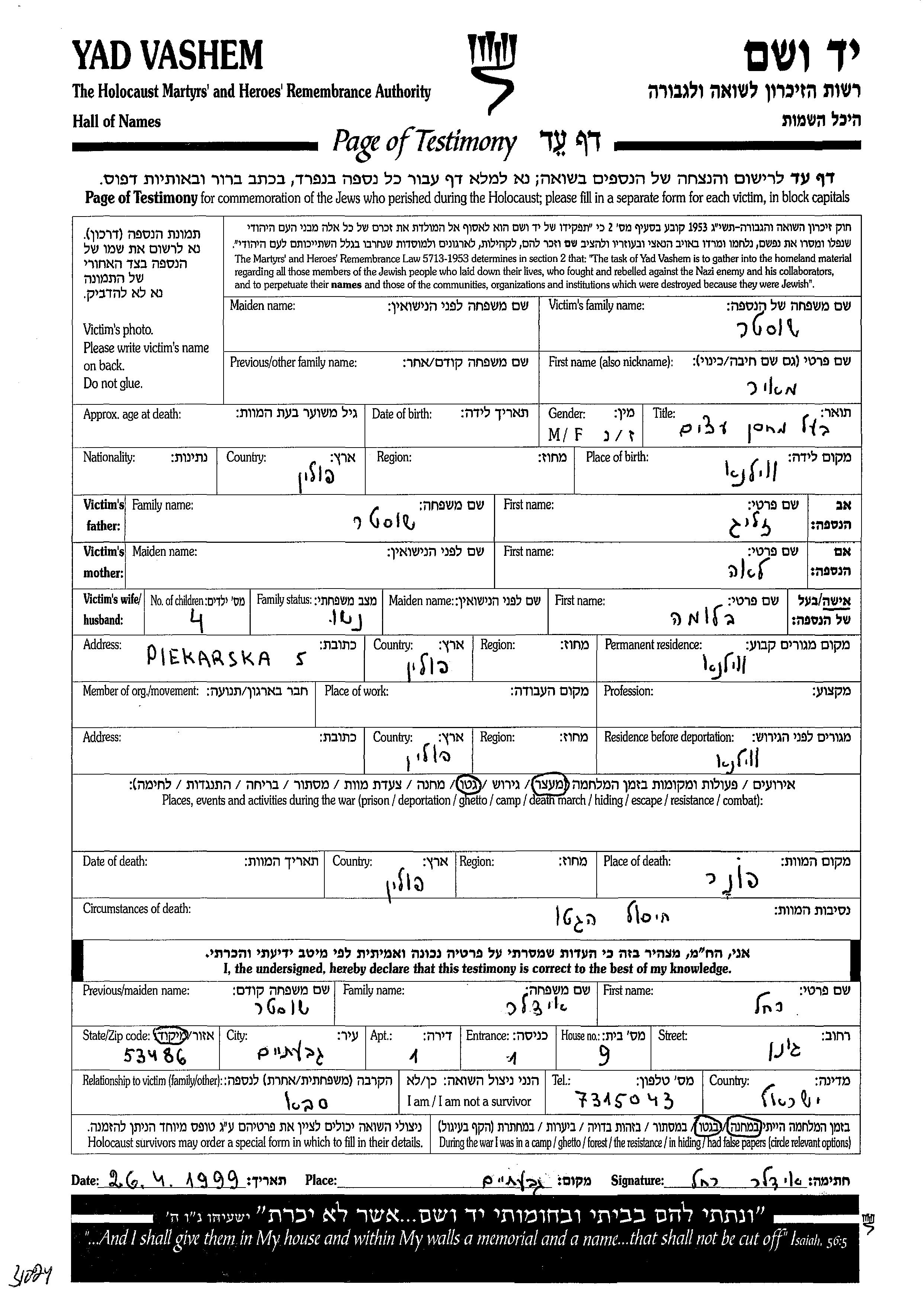 Шустер Меир Вильно, Польша Лист свидетельских показаний