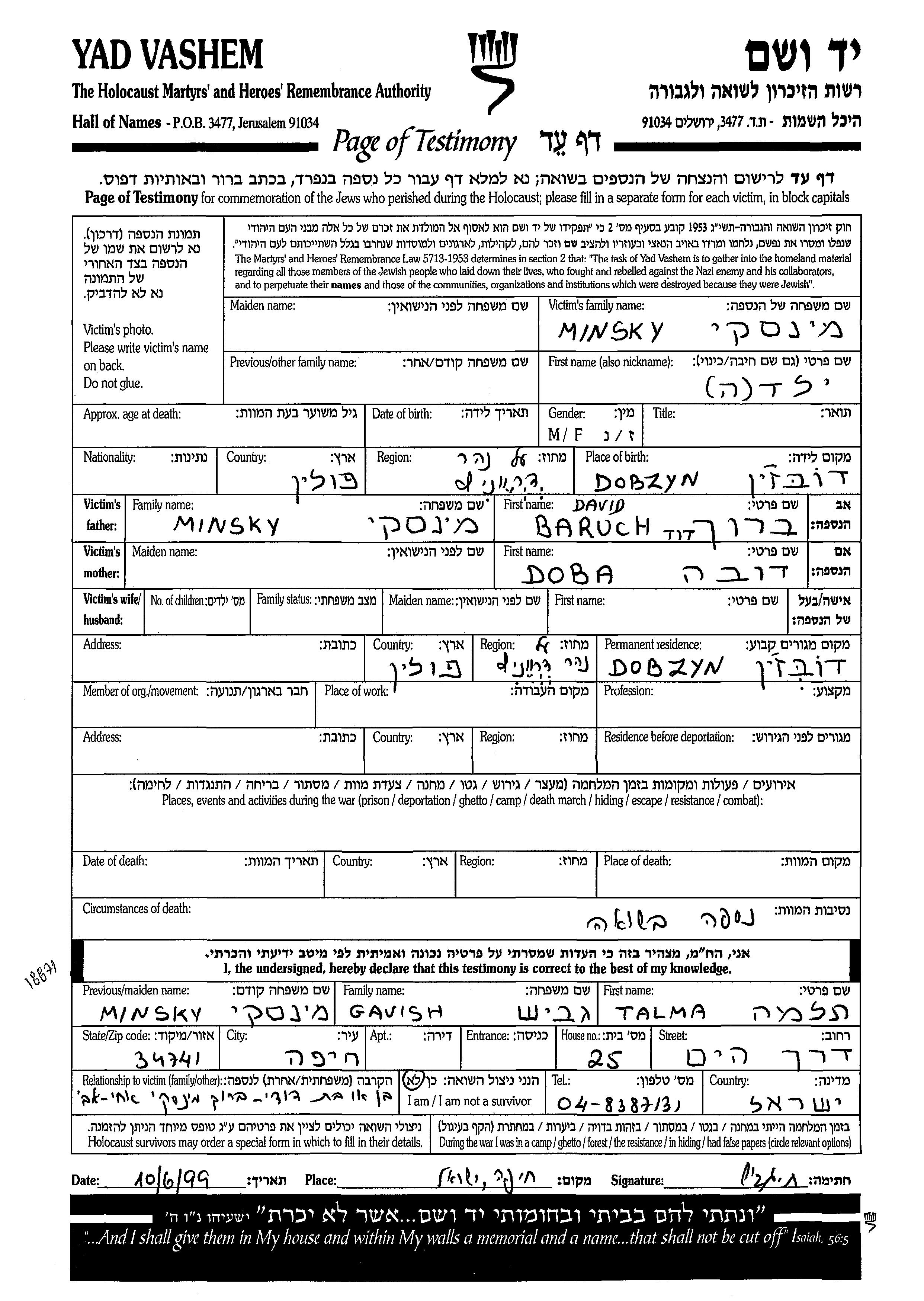Имя неизвестно Мински, место рождения: Добжинь-над-Дрвенцой, Польша. Отец: Барух Давид, mать:Доба. Место жительства до войны: Добжинь-над-Дрвенцой, Польша.