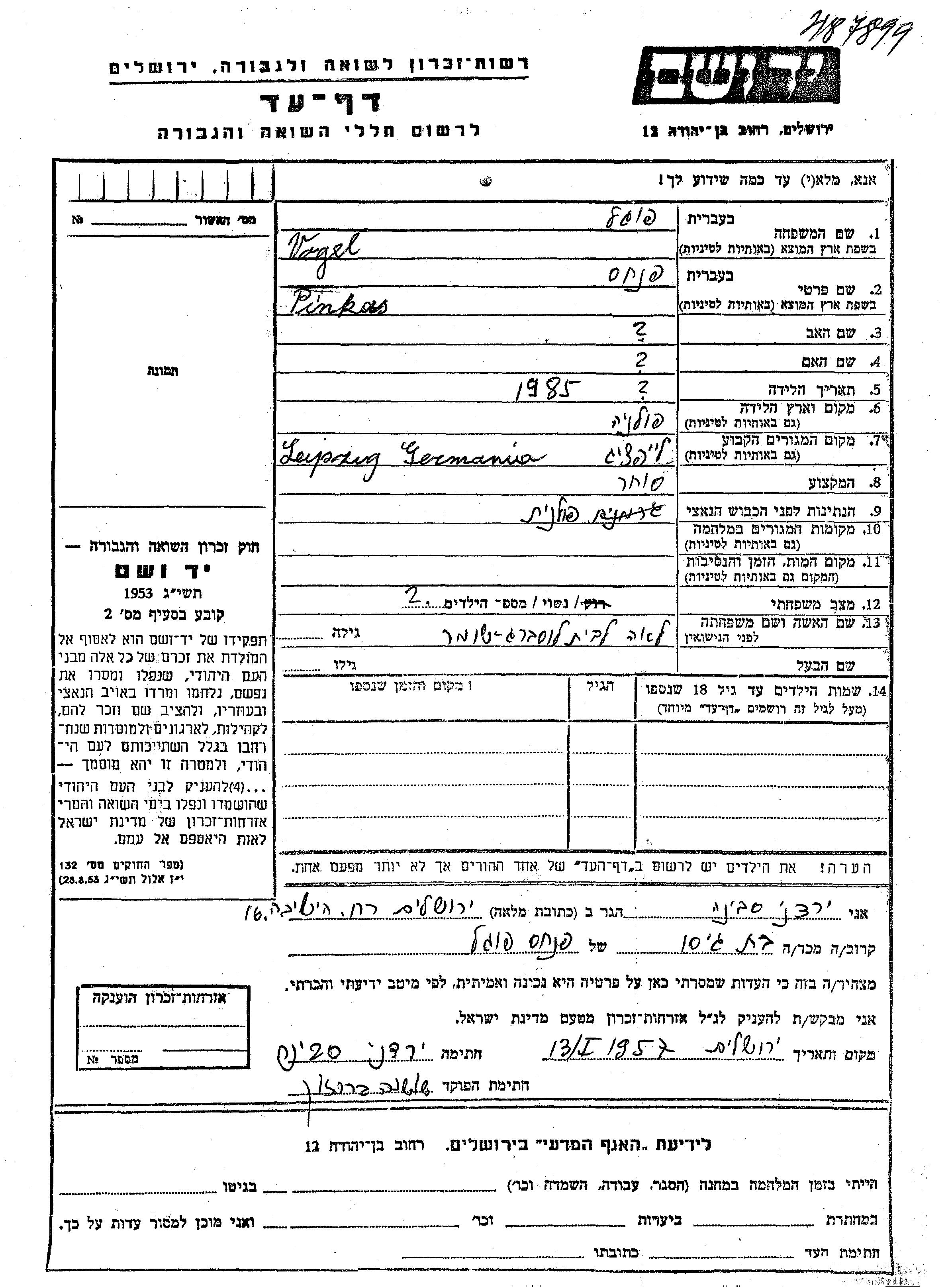 Фогель Пинкас 1885 Лейпциг, Германия Лист свидетельских показаний