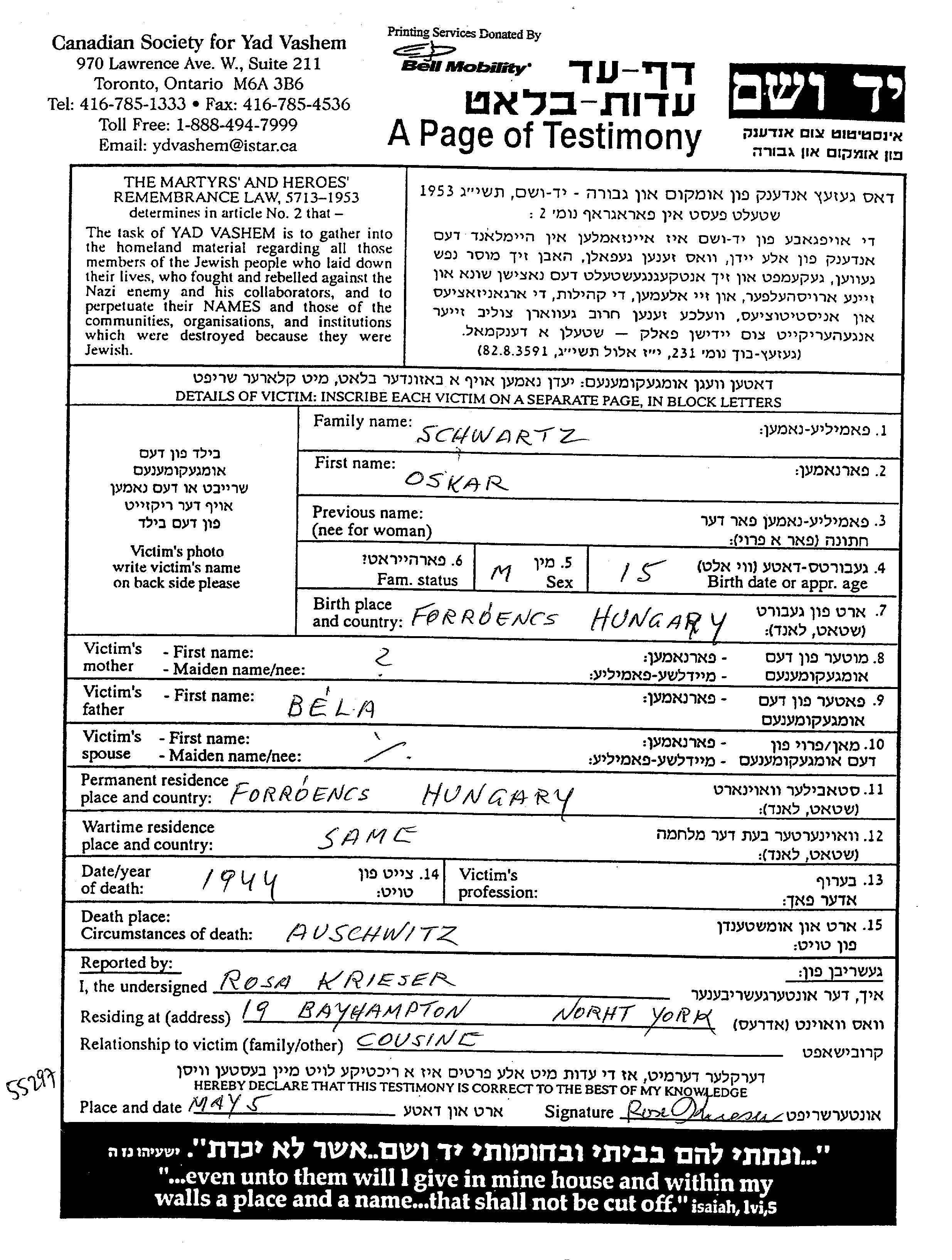 Оскар Шварц, место рождения: Форроэнч, Венгрия. Отец: Бела. Место жительства до войны: Форроэнч, Венгрия. Место во время войны: Форроэнч, Венгрия.