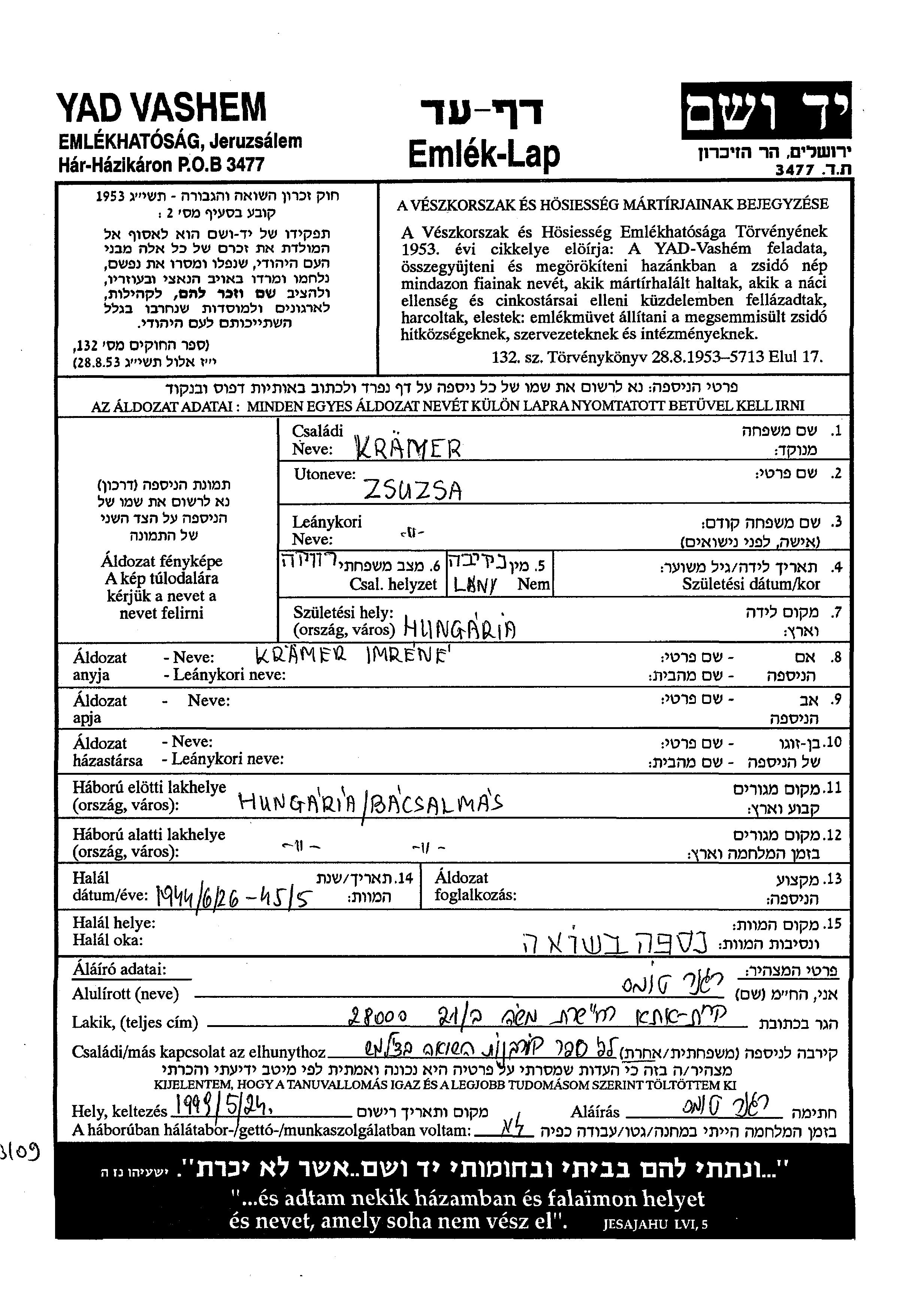 Кремер Жужа Бачальмаш, Венгрия Лист свидетельских показаний