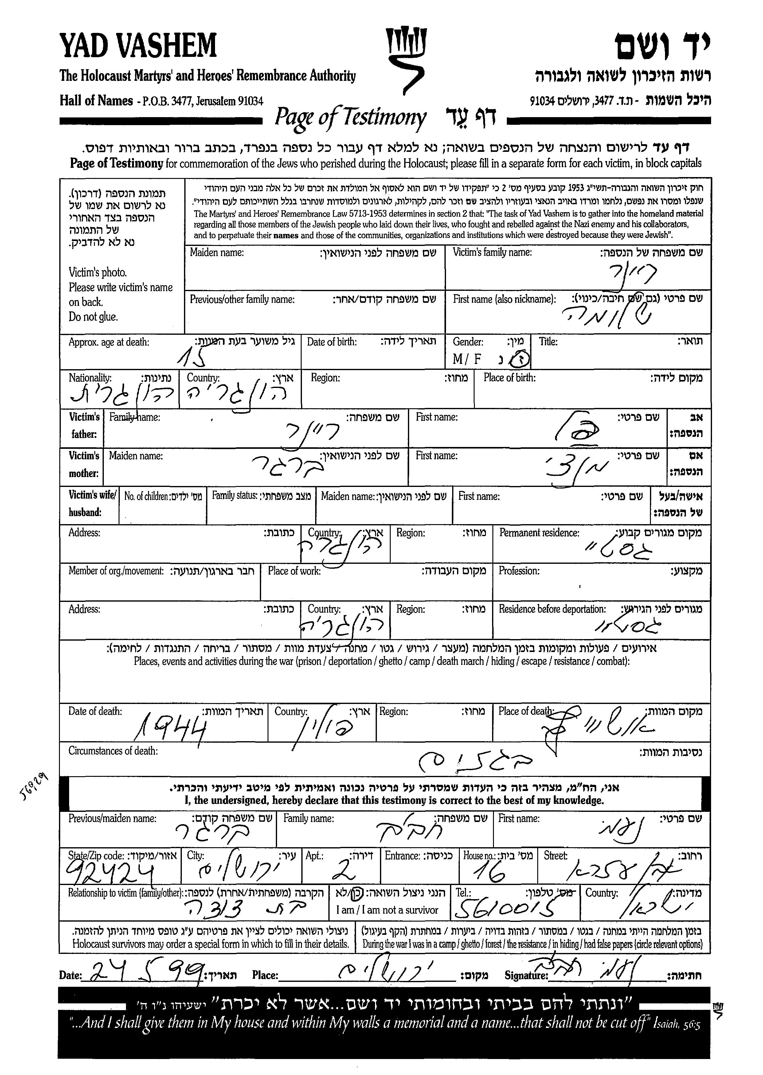 Яд Вашем - Листы свидетельских показаний Мемориального фонда