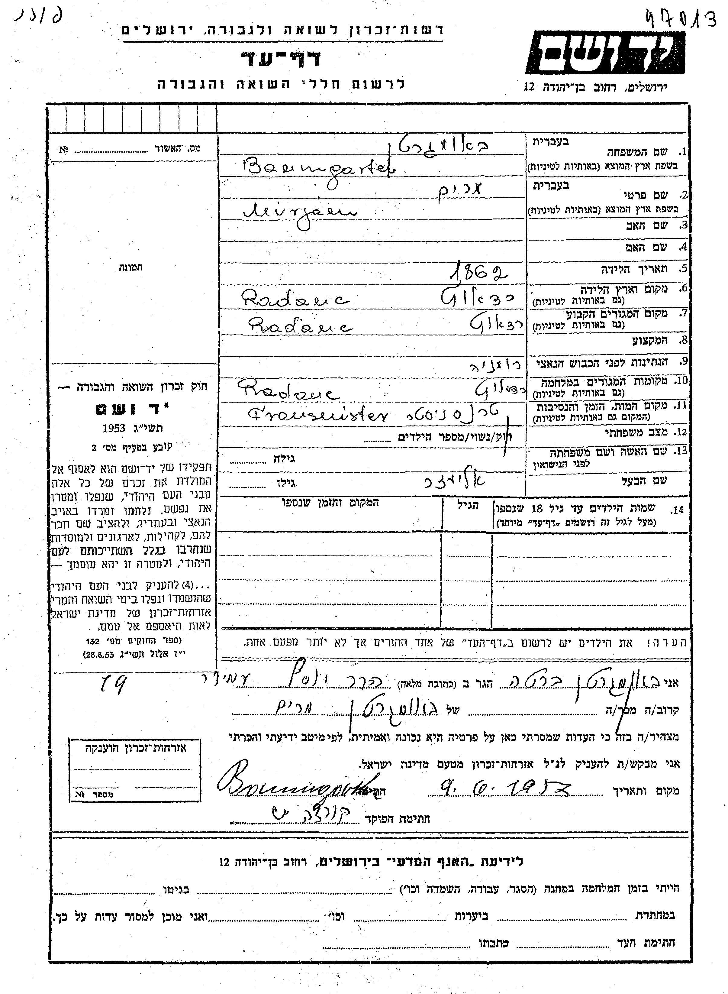 Мирьям Баумгартен, место рождения: Радауц, Румыния. Женат / замужем. Место жительства до войны: Радауц, Румыния. Место во время войны: Радауц, Румыния.