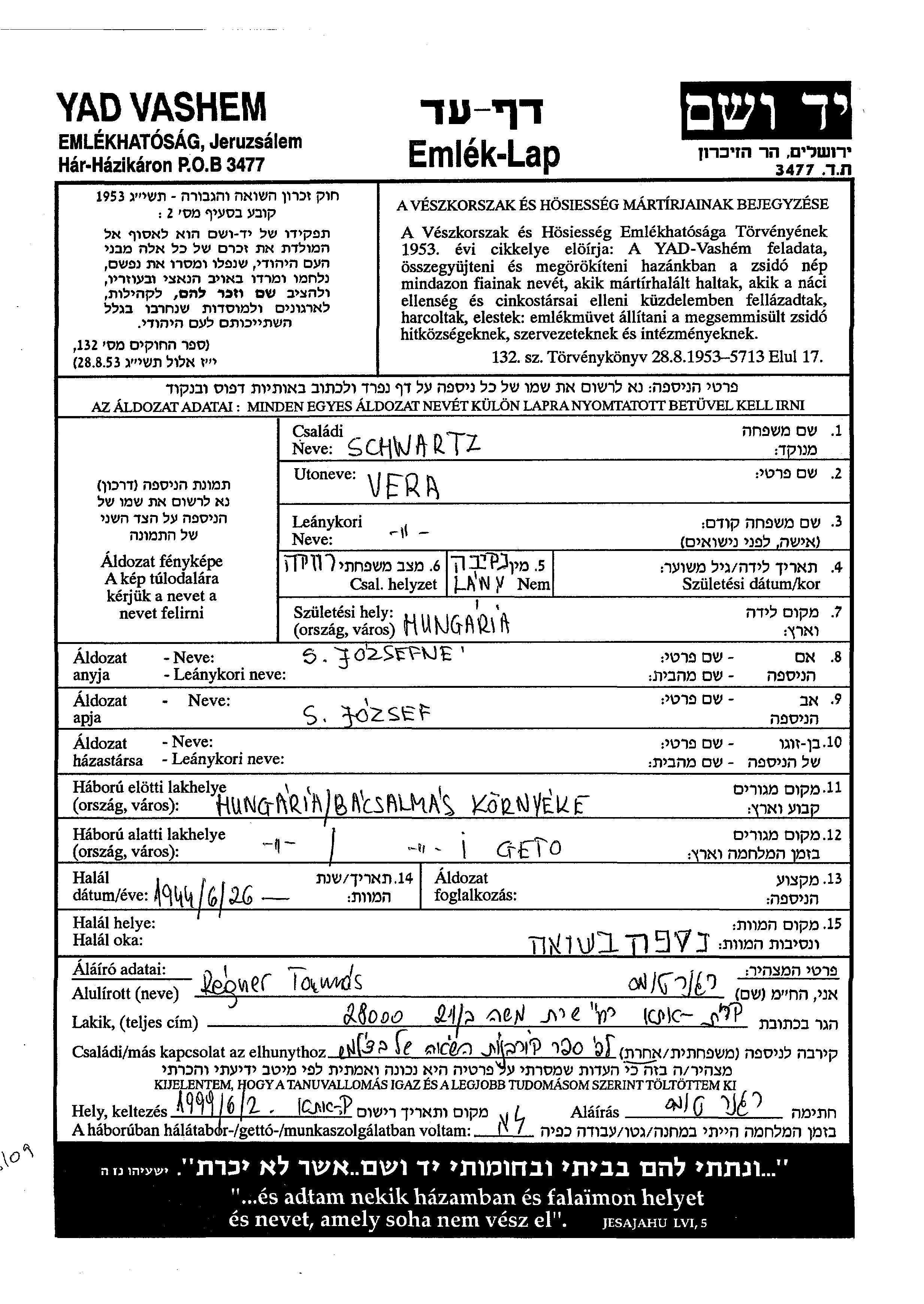Вера Шварц, место рождения: Венгрия. Отец: Йозеф, mать:Йожефне. Холост / не замужем. Место жительства до войны: Бачальмаш, Венгрия. Место во время войны: Бачальмаш, Венгрия.