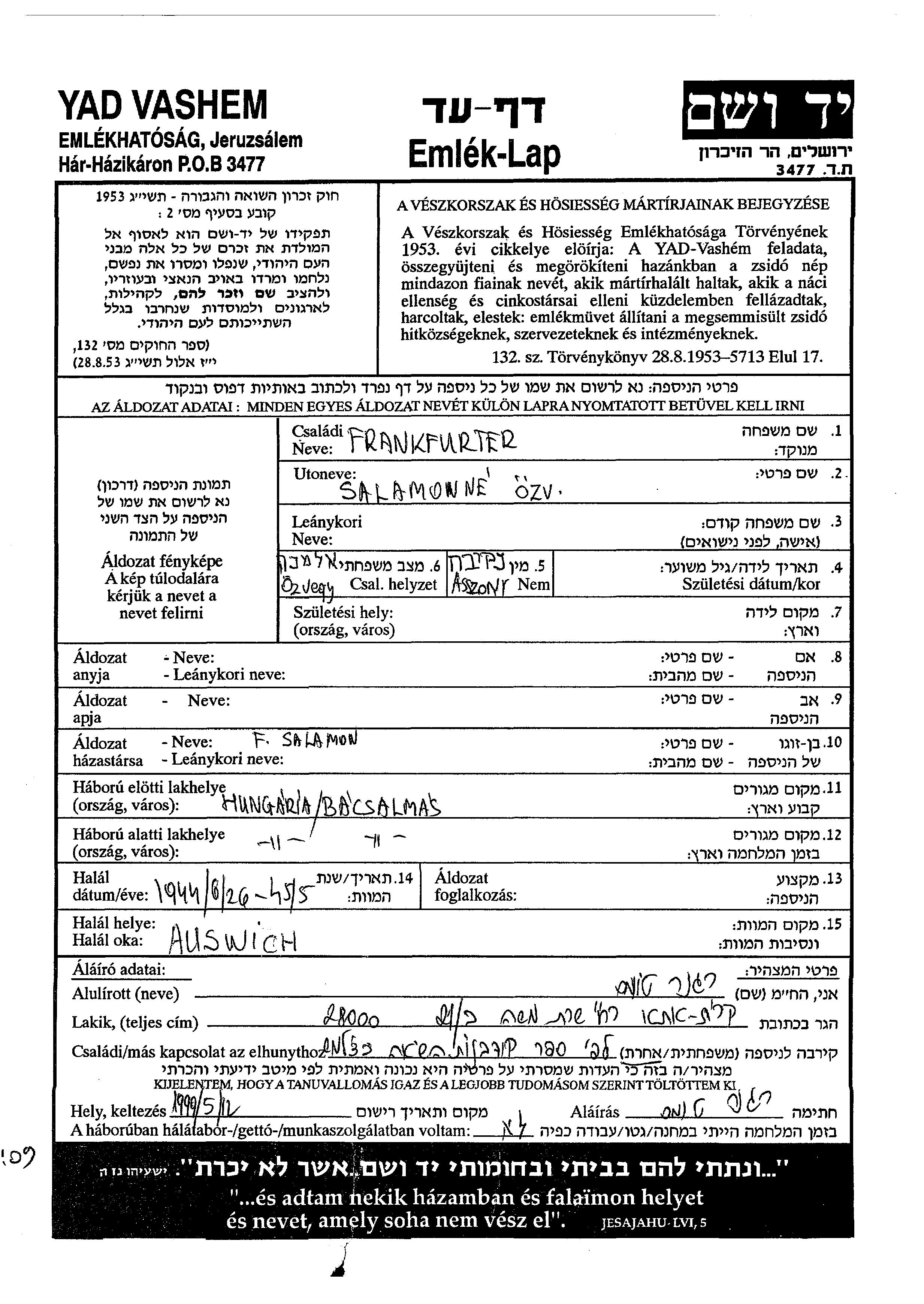 Имя неизвестно Франкфуртер. Вдова. Место жительства до войны: Бачальмаш, Венгрия. Место во время войны: Бачальмаш, Венгрия.