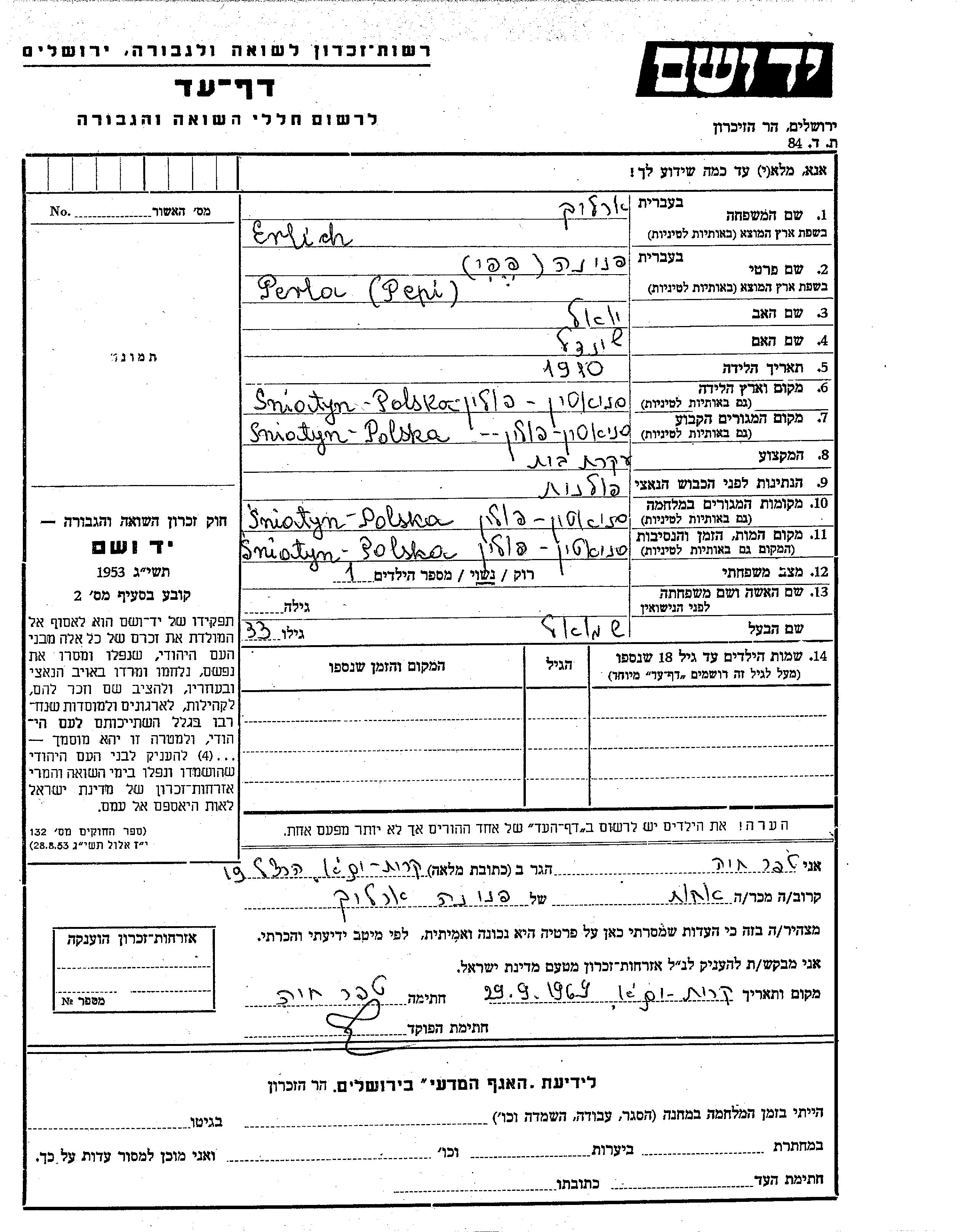 Перла Пепи Пнина Эрлих, место рождения: Снятын, Польша. Отец: Йоэль, mать:Шейндел. Домохозяйка. Женат / замужем. Место жительства до войны: Снятын, Польша. Место во время войны: Снятын, Польша.