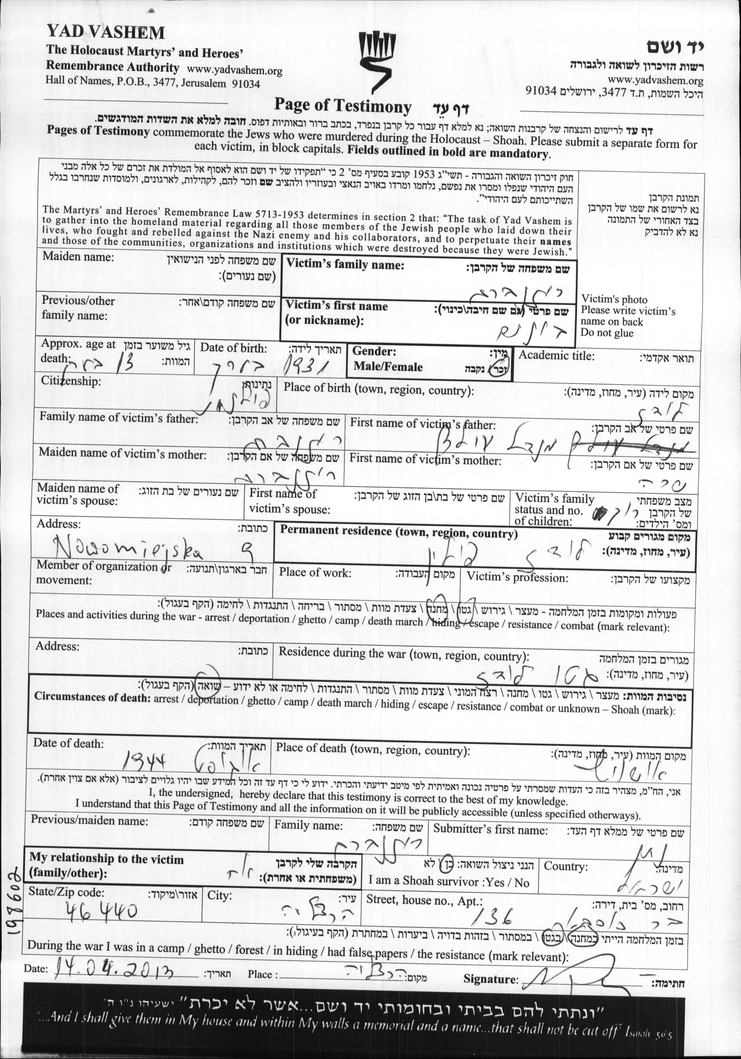 Яд Вашем - Листы свидетельских показаний Мемориального фонда
