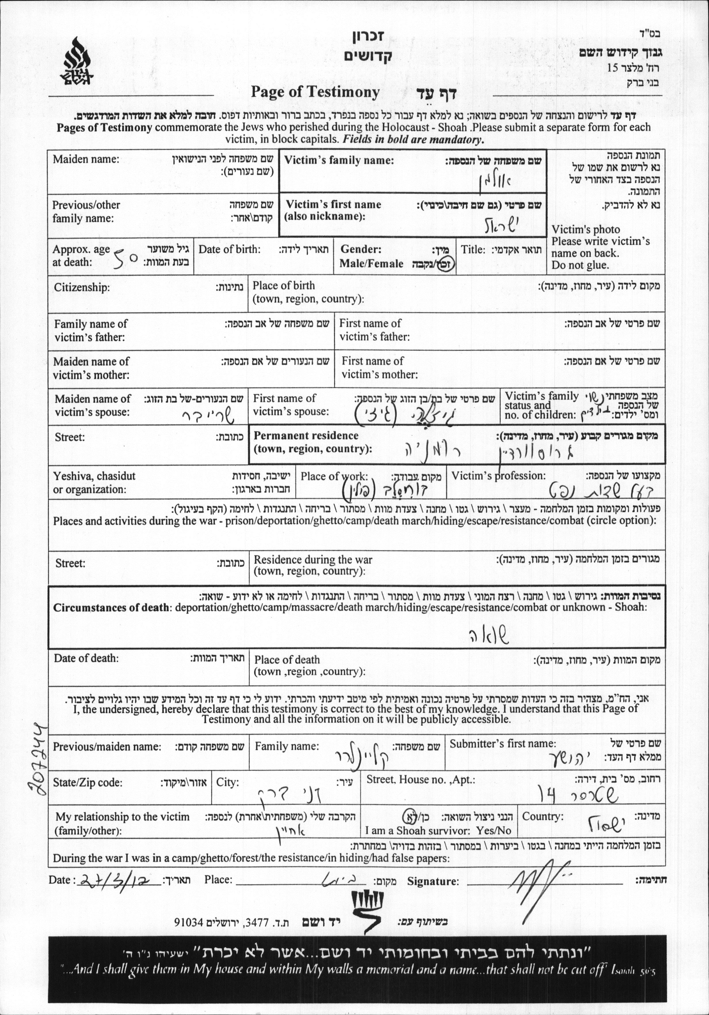 Яд Вашем - Листы свидетельских показаний Мемориального фонда