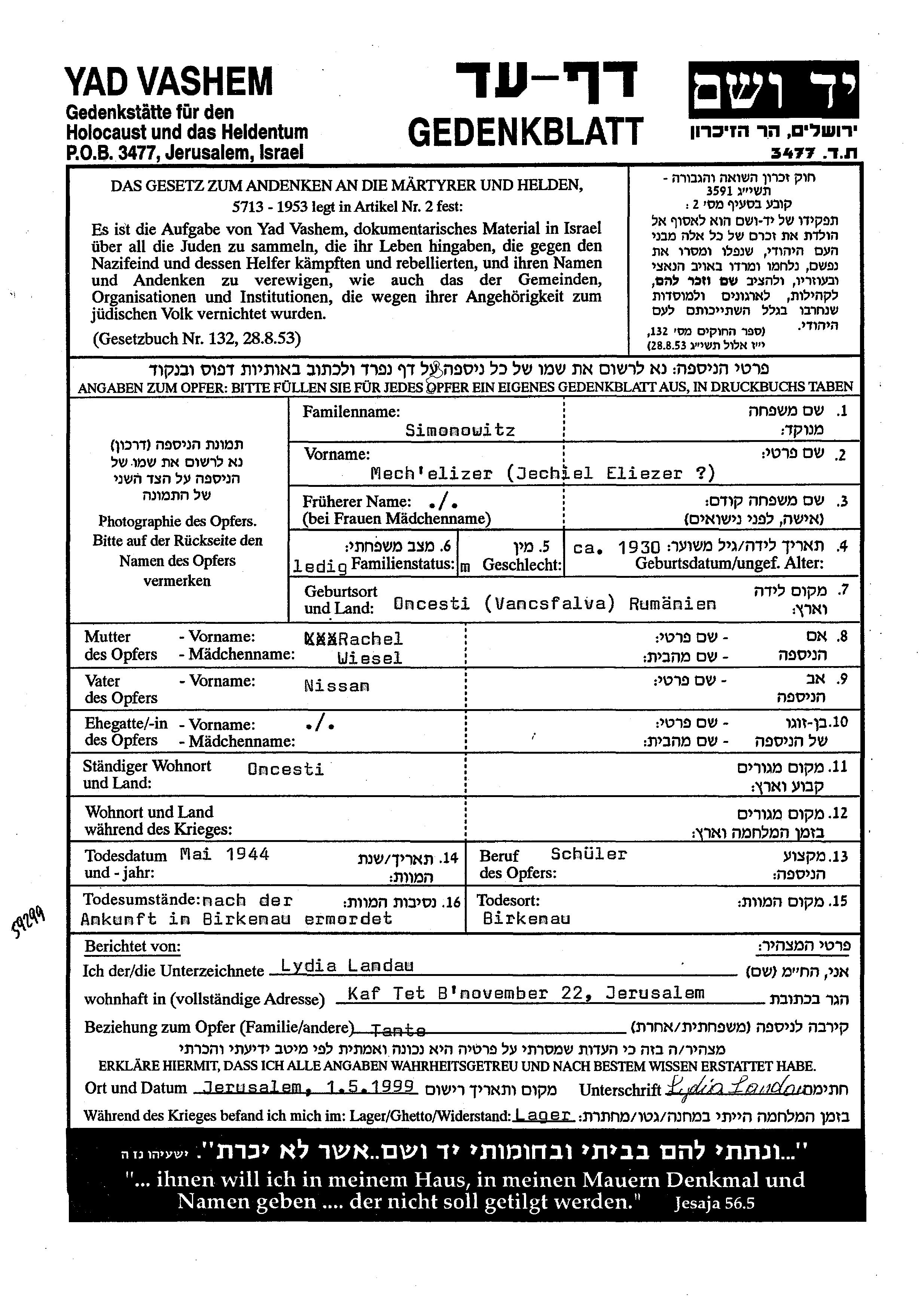 Симоновиц Элизер Ехиель 1930 Ончешть, Румыния Лист свидетельских показаний