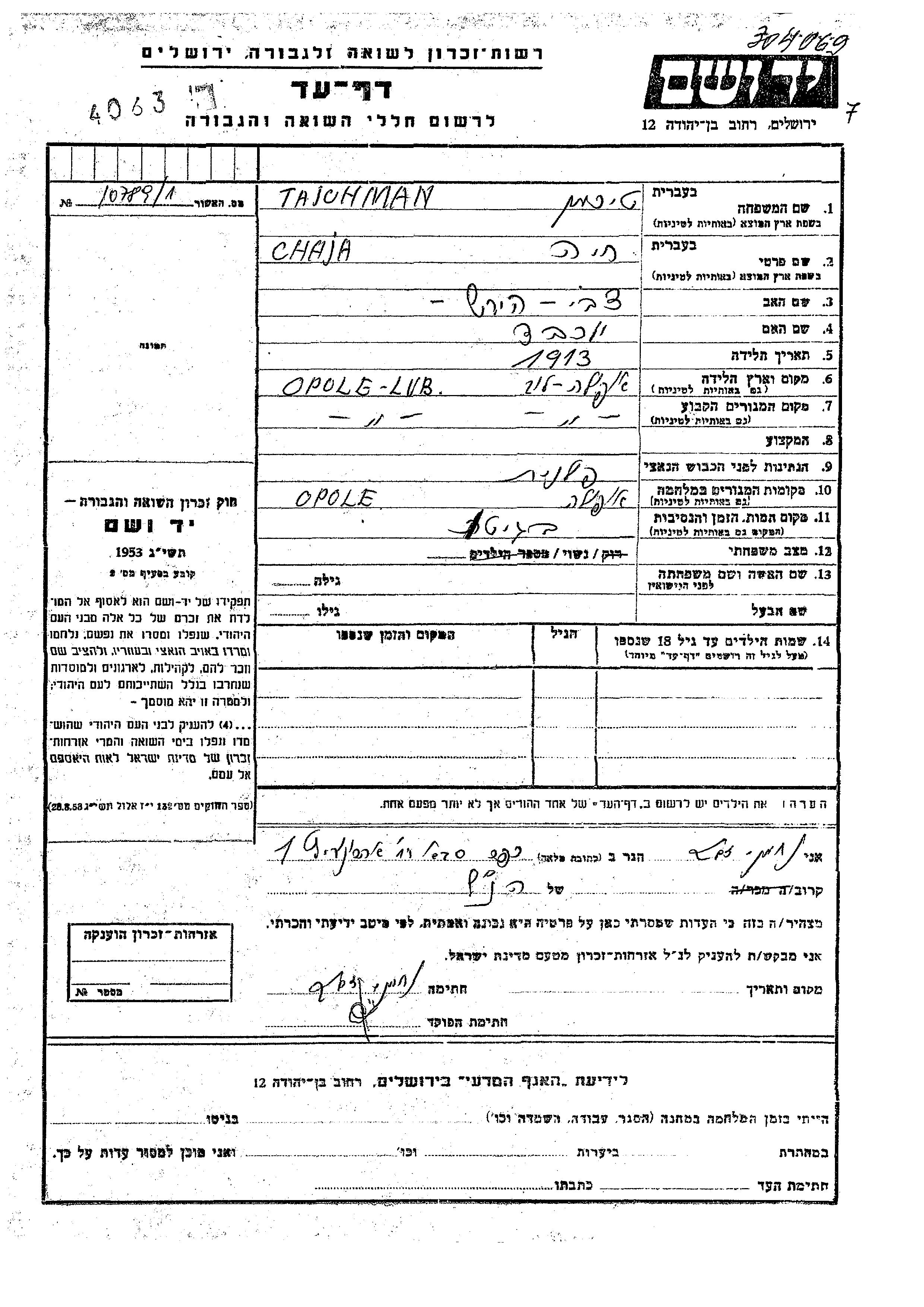 Тайхман Тихман Хая 1913 Ополе-Любельске, Польша Лист свидетельских показаний