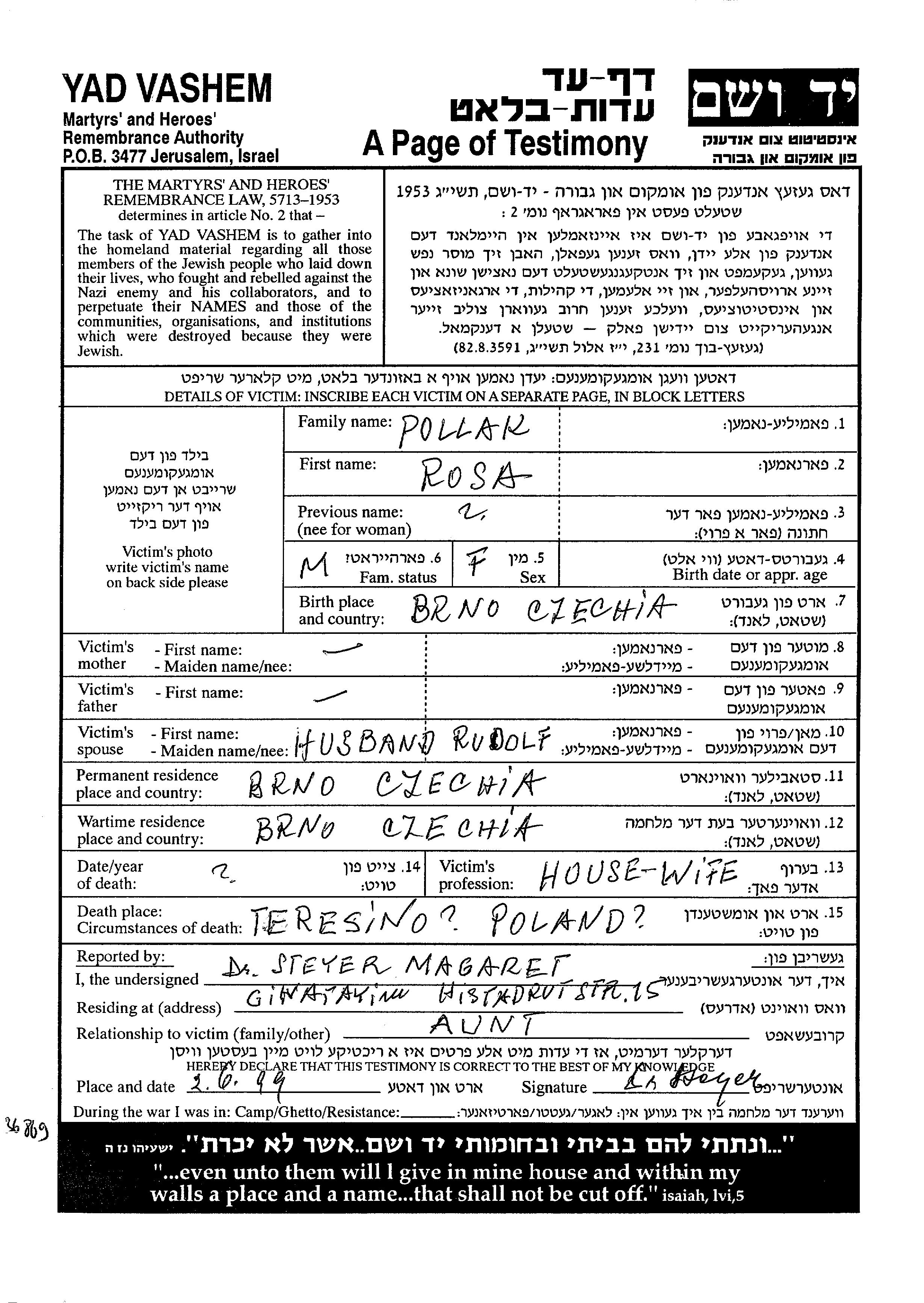 Поллак Роза Брно, Чехословакия Лист свидетельских показаний