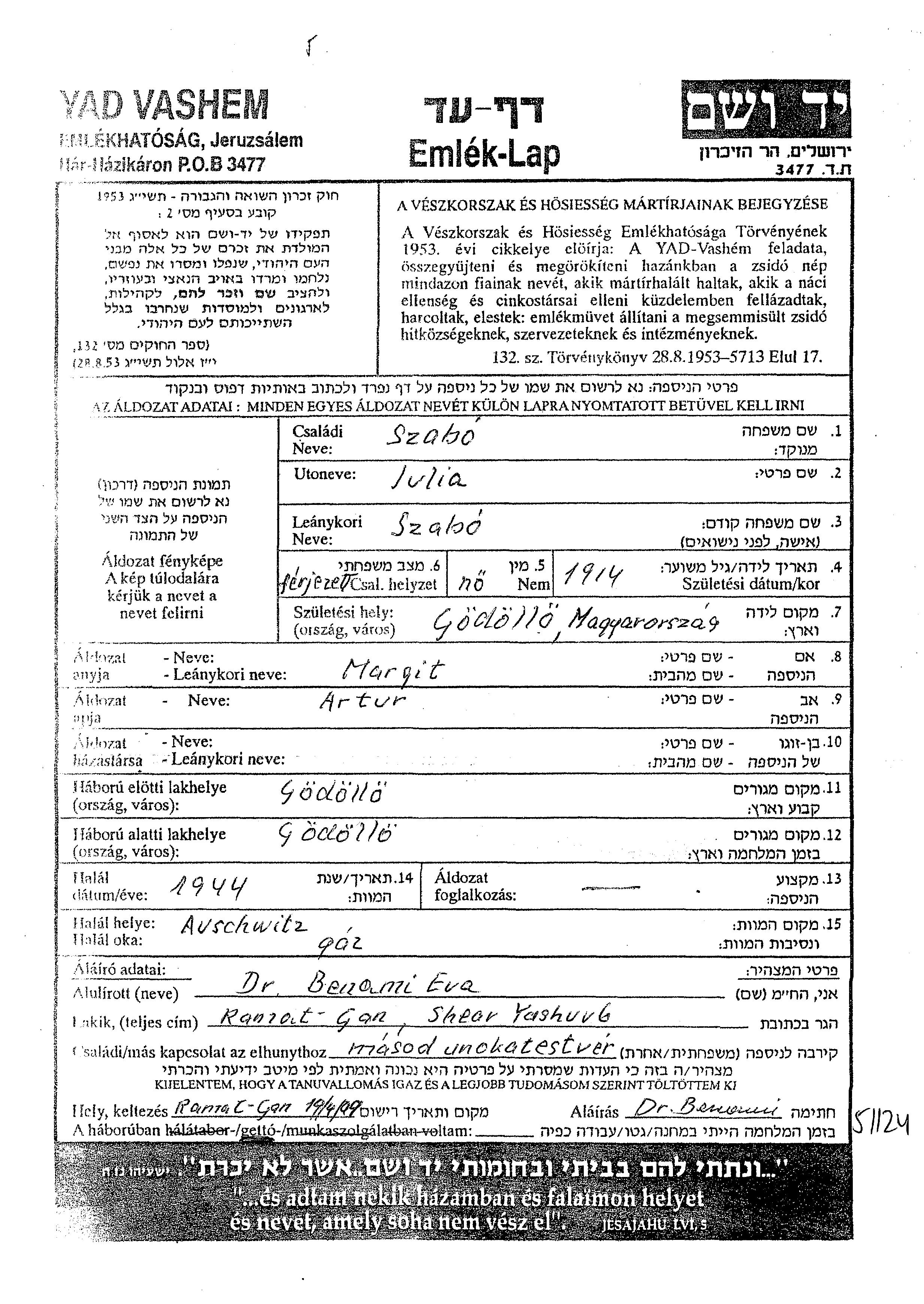 Юлия Сабо, место рождения: Годолло, Венгрия. Отец: Артур, mать:Маргит. Женат / замужем. Место жительства до войны: Годолло, Венгрия. Место во время войны: Годолло, Венгрия.